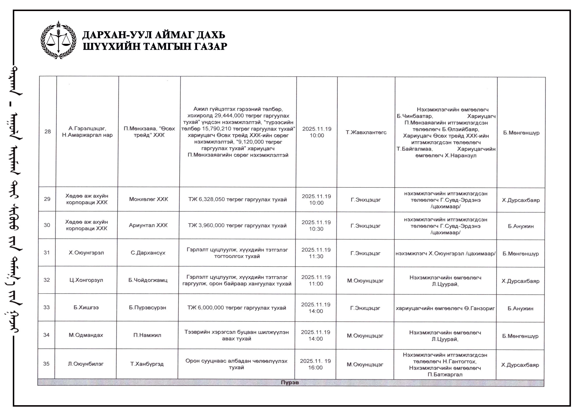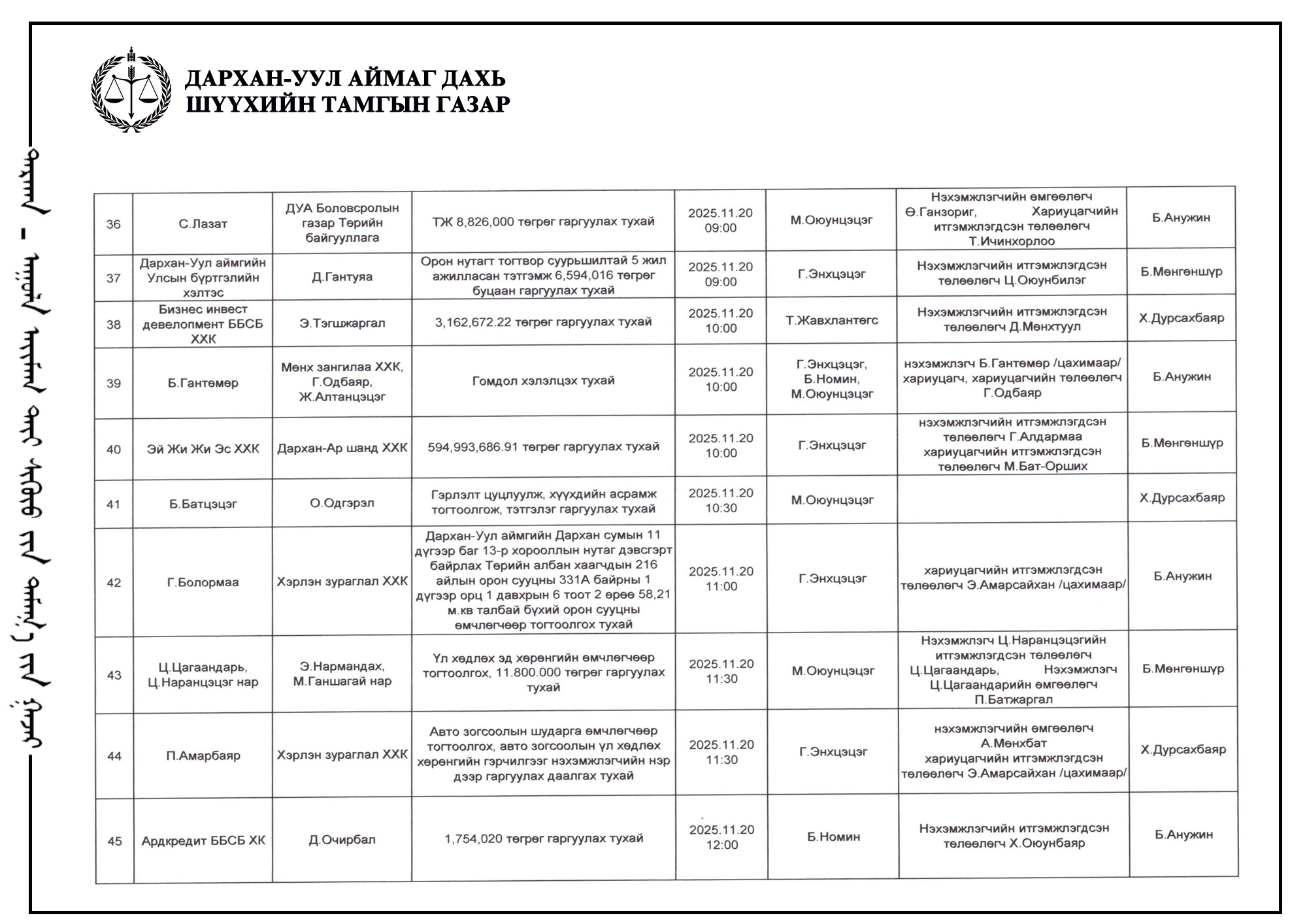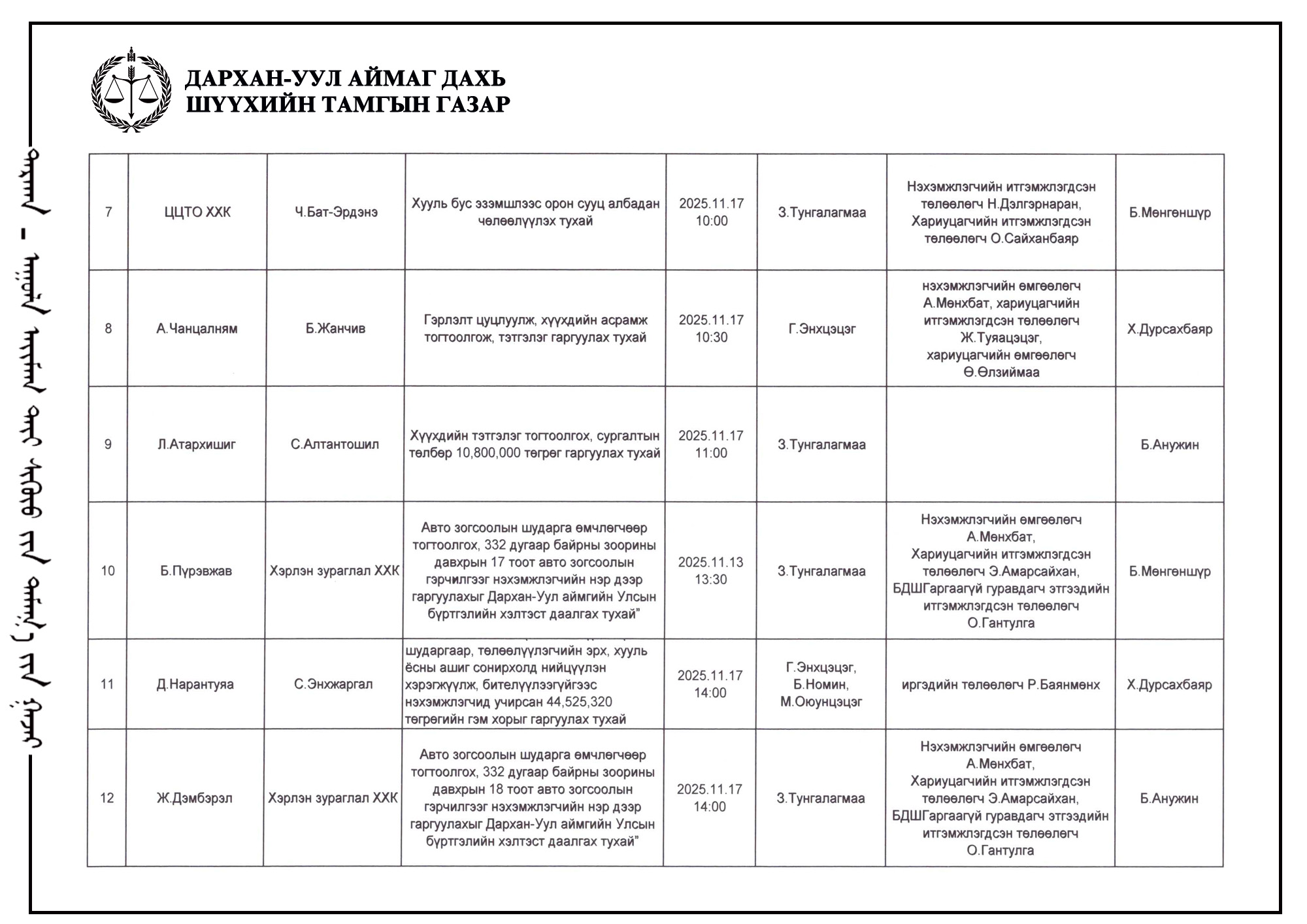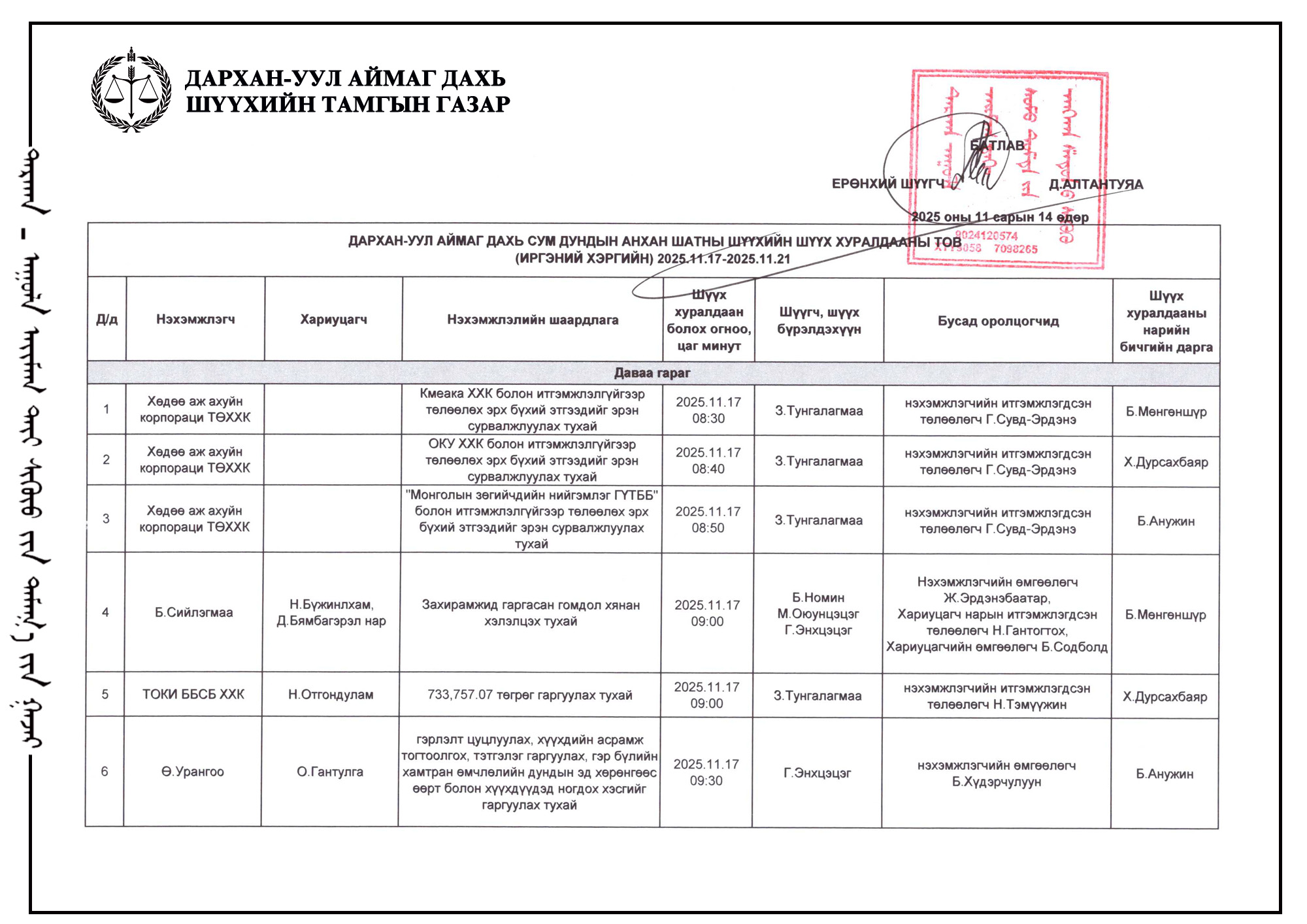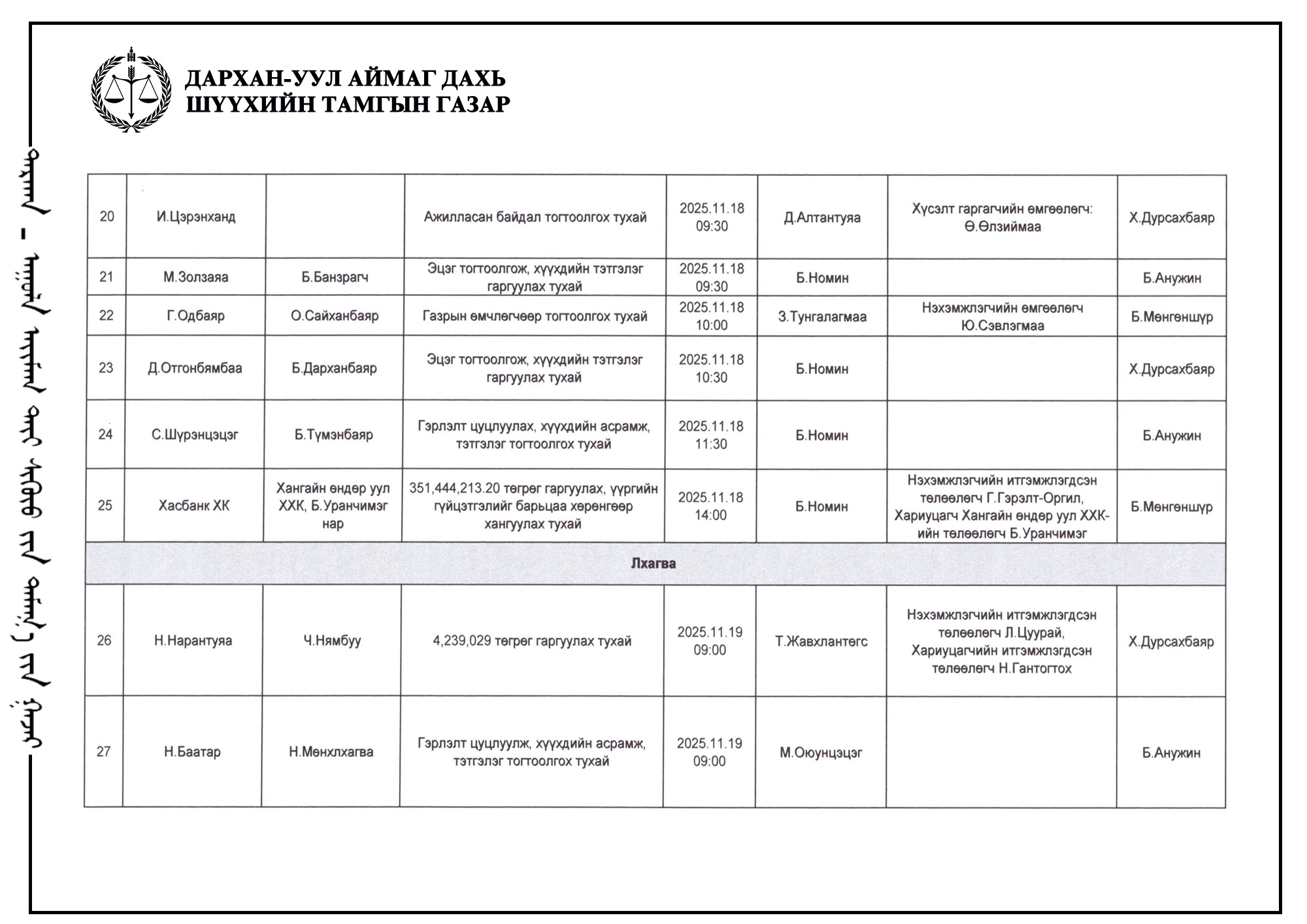 ШҮҮХ ХУРАЛДААНЫ ТОВ /Иргэний хэргийн анхан шатны шүүх 2025.11.17-11.20/