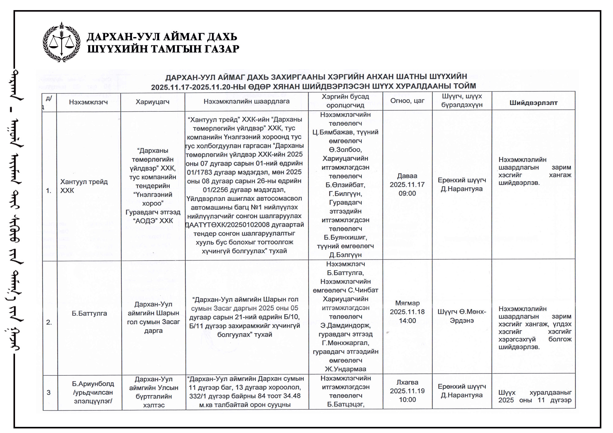 ШҮҮХ ХУРАЛДААНЫ ТОВ /Иргэний хэргийн анхан шатны шүүх 2025.11.17-11.20/