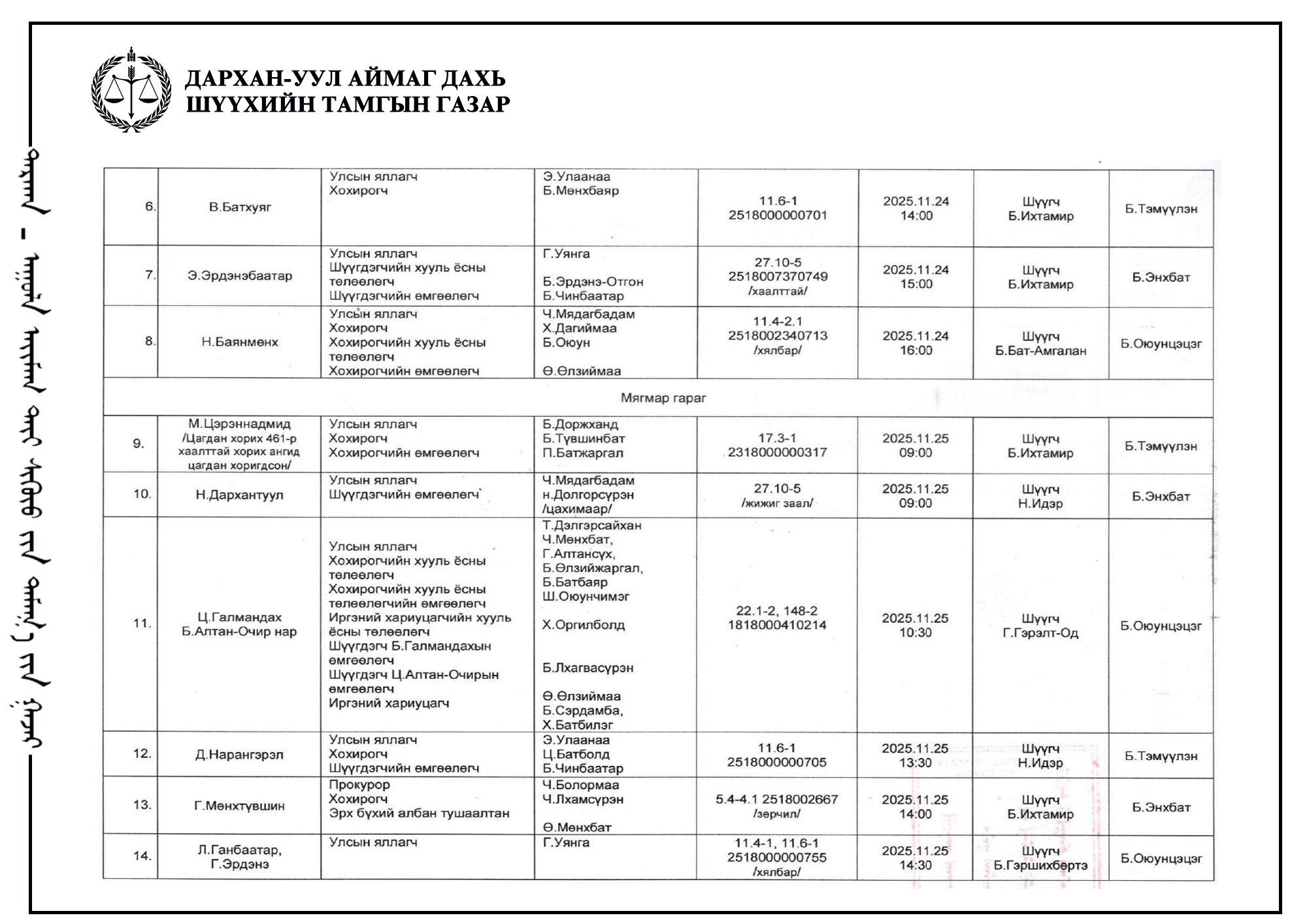 ШҮҮХ ХУРАЛДААНЫ ТОЙМ /Эрүүгийн хэргийн анхан шатны шүүх 2025.11.10-11.14/