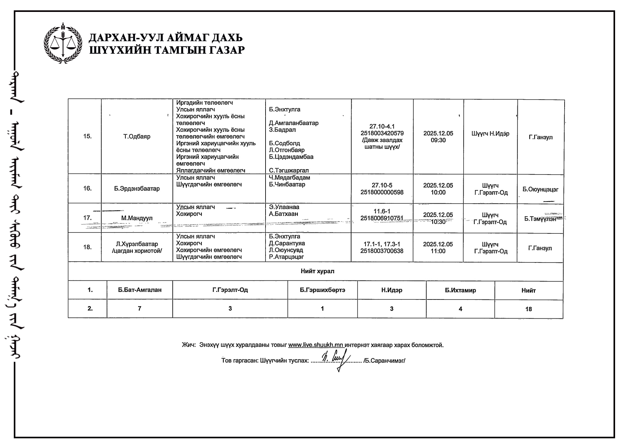 ШҮҮХ ХУРАЛДААНЫ ТОЙМ /Эрүүгийн хэргийн анхан шатны шүүх 2025.11.17-11.21/