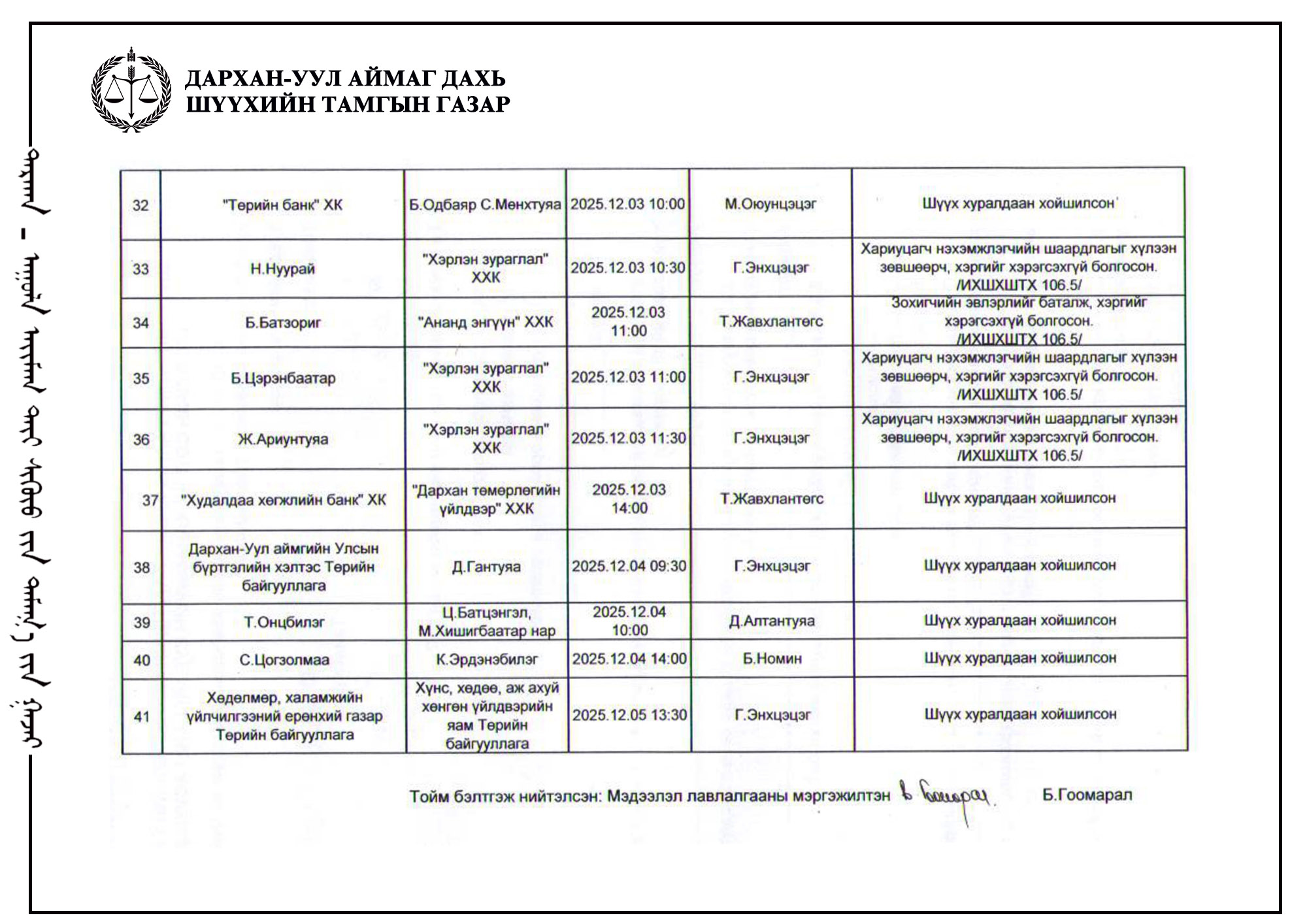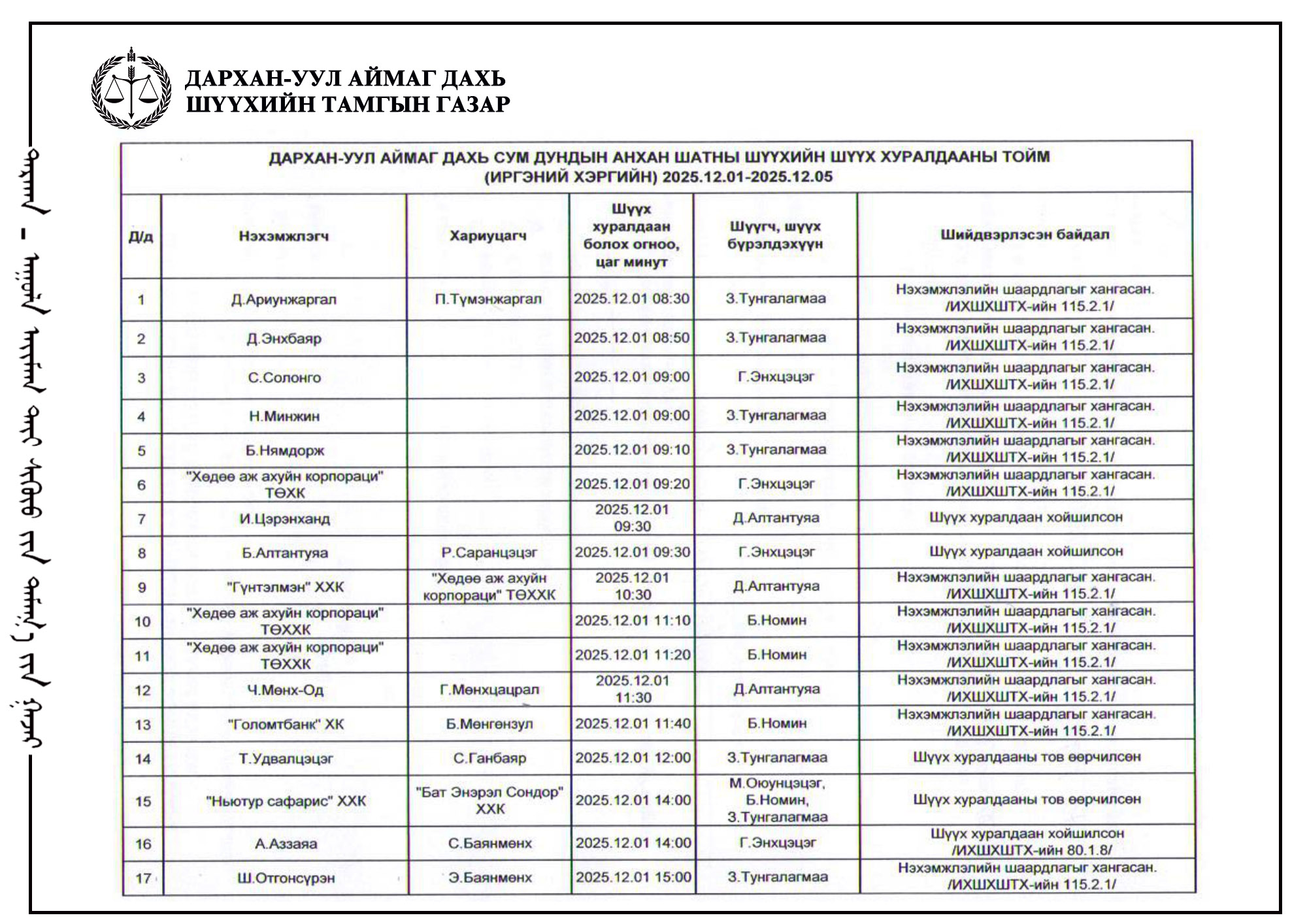 ШҮҮХ ХУРАЛДААНЫ ТОЙМ /Эрүүгийн хэргийн анхан шатны шүүх 2025.12.01-12.05/
