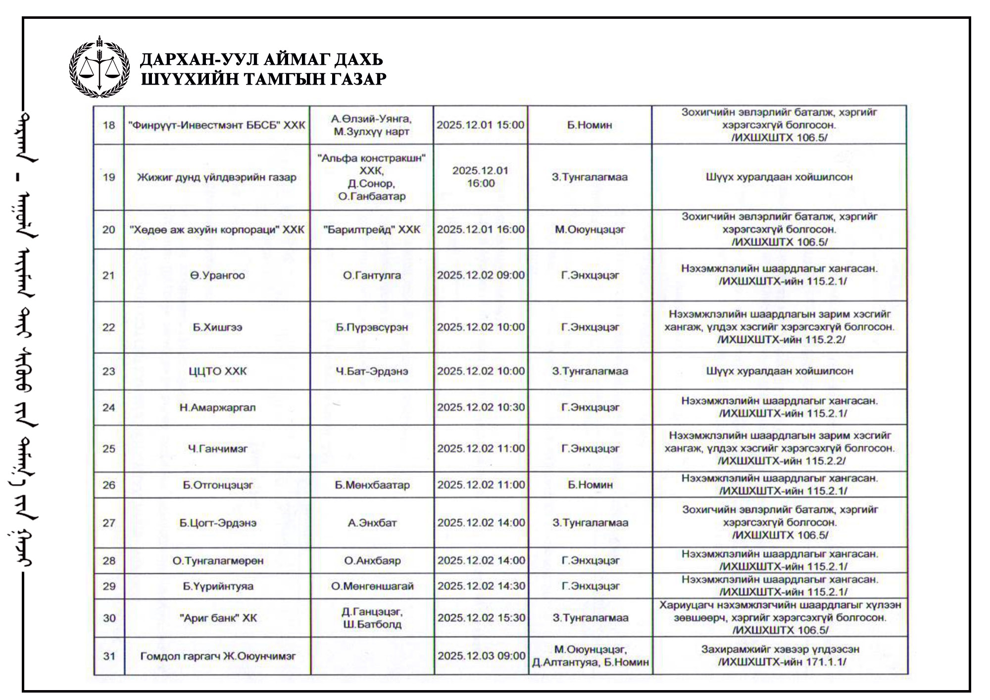 ШҮҮХ ХУРАЛДААНЫ ТОЙМ /Иргэний хэргийн анхан шатны шүүх 2025.12.01-12.05/