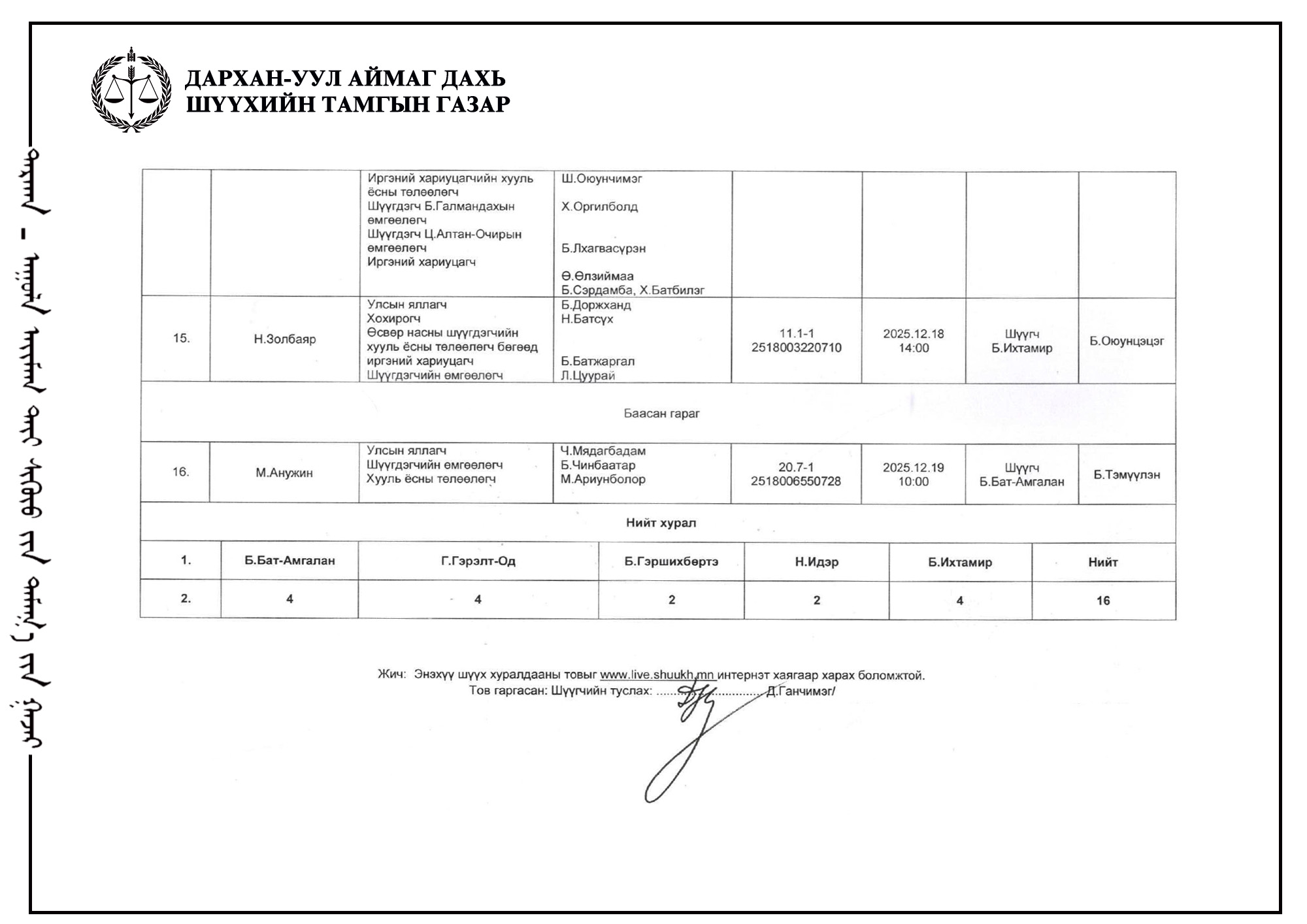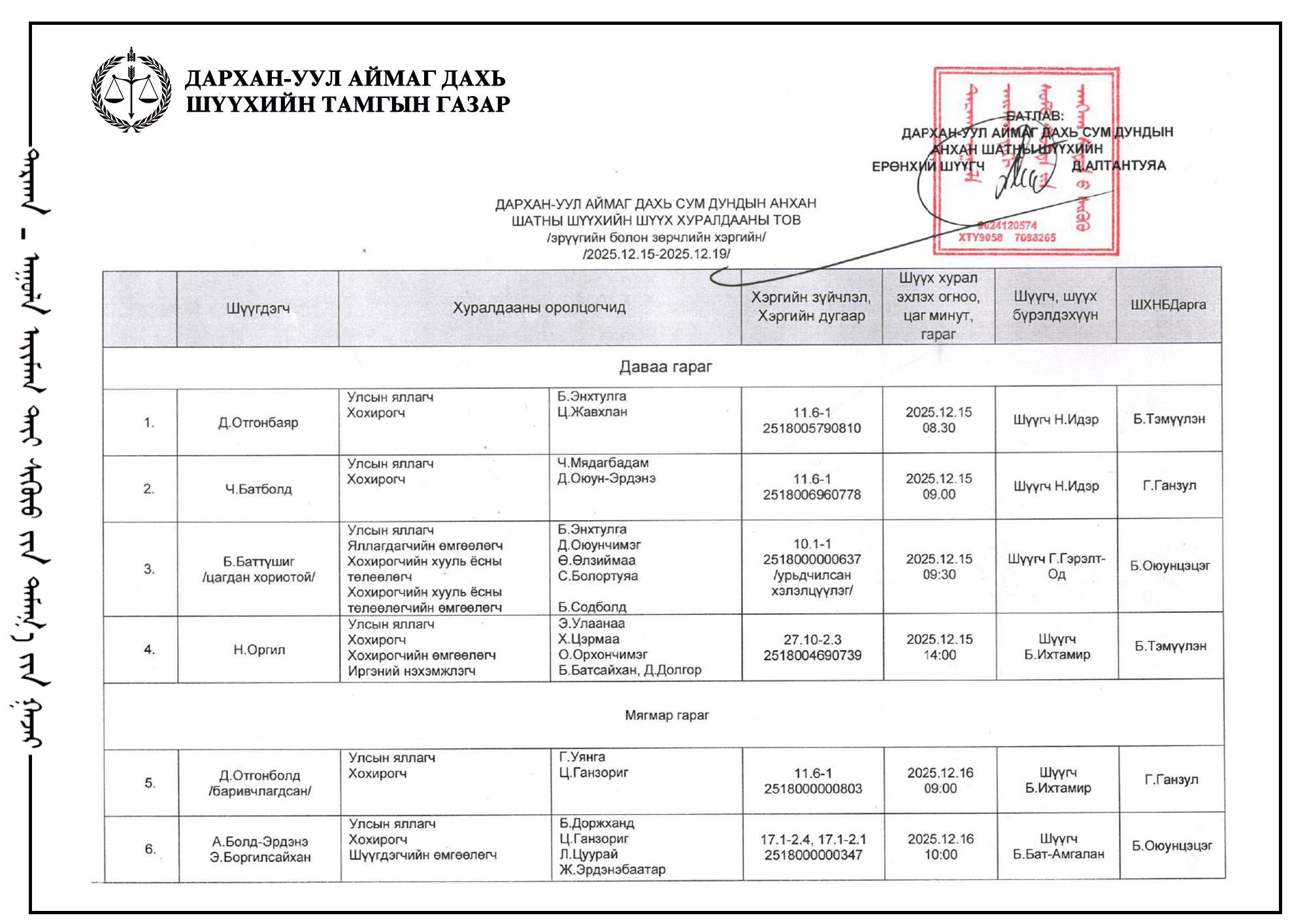 ШҮҮХ ХУРАЛДААНЫ ТОВ /Эрүүгийн хэргийн анхан шатны шүүх 2025.12.15-12.19/