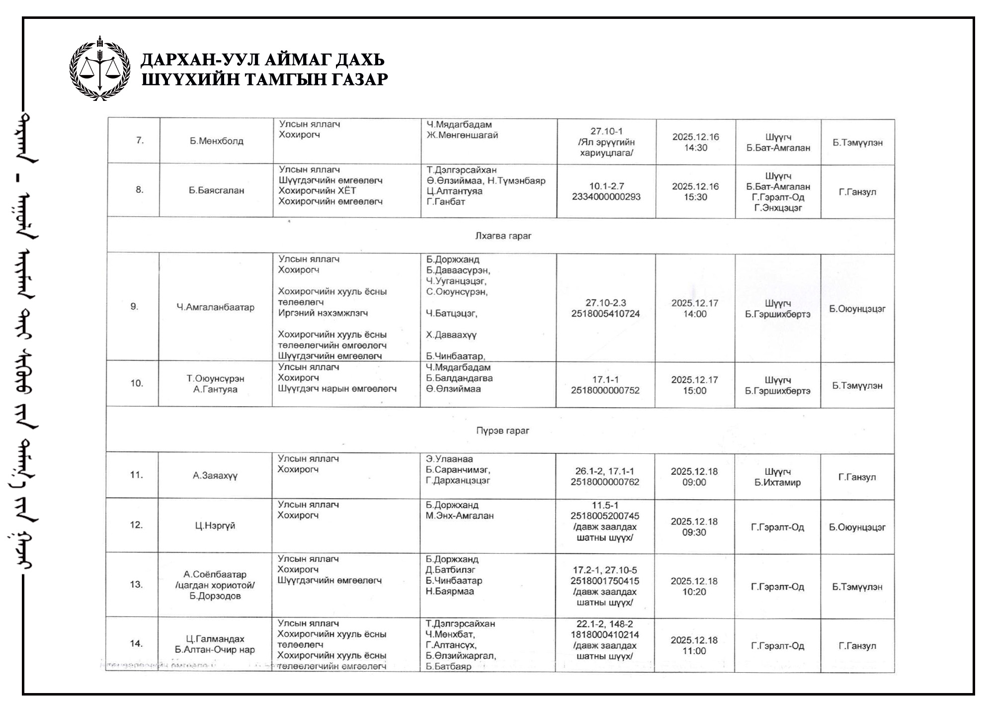 ШҮҮХ ХУРАЛДААНЫ ТОЙМ /Эрүүгийн хэргийн анхан шатны шүүх 2025.12.08-12.12/