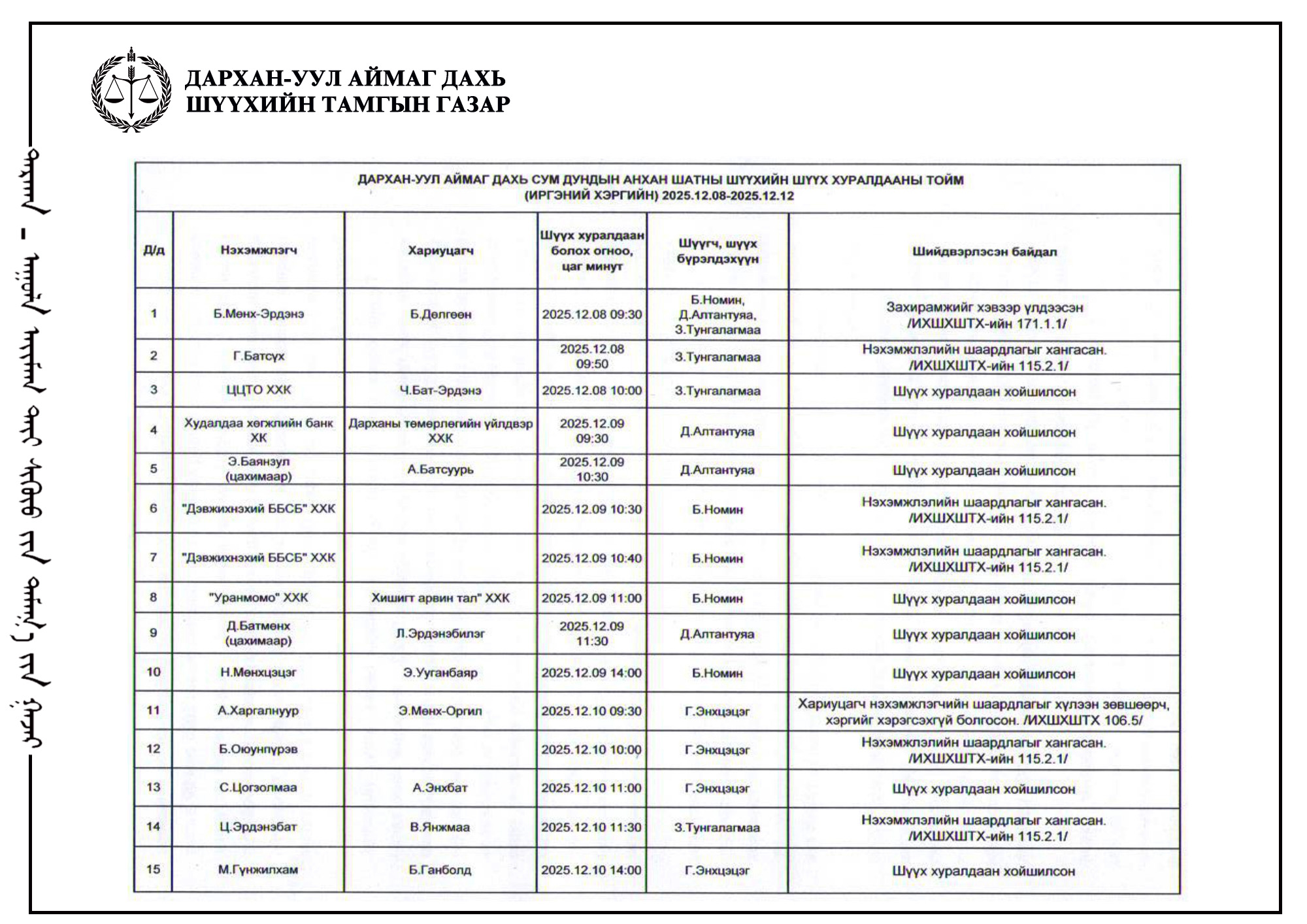 ШҮҮХ ХУРАЛДААНЫ ТОЙМ /Эрүүгийн хэргийн анхан шатны шүүх 2025.12.08-12.12/