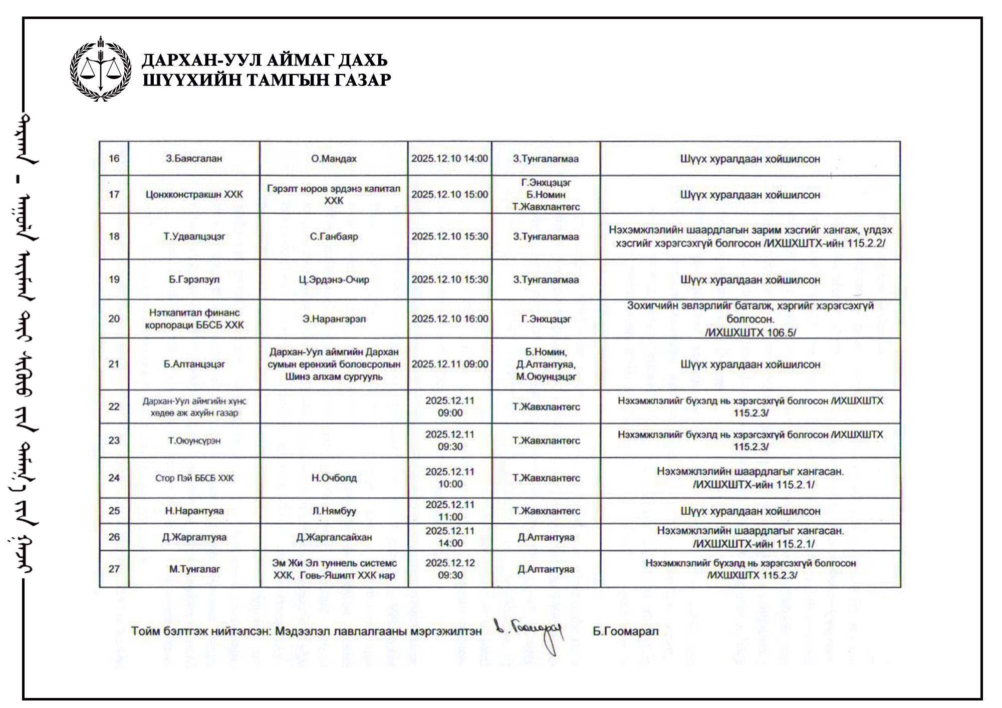 ШҮҮХ ХУРАЛДААНЫ ТОЙМ /Иргэний хэргийн анхан шатны шүүх 2025.12.01-12.05/
