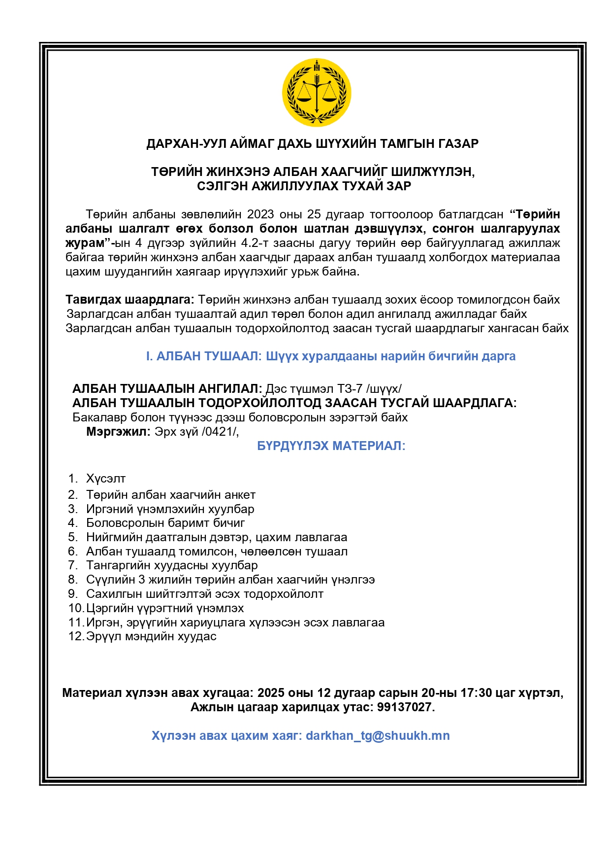 ТӨРИЙН ҮЙЛЧИЛГЭЭНИЙ АЛБАН ТУШААЛД СОНГОН ШАЛГАРУУЛЖ АЖИЛД АВНА