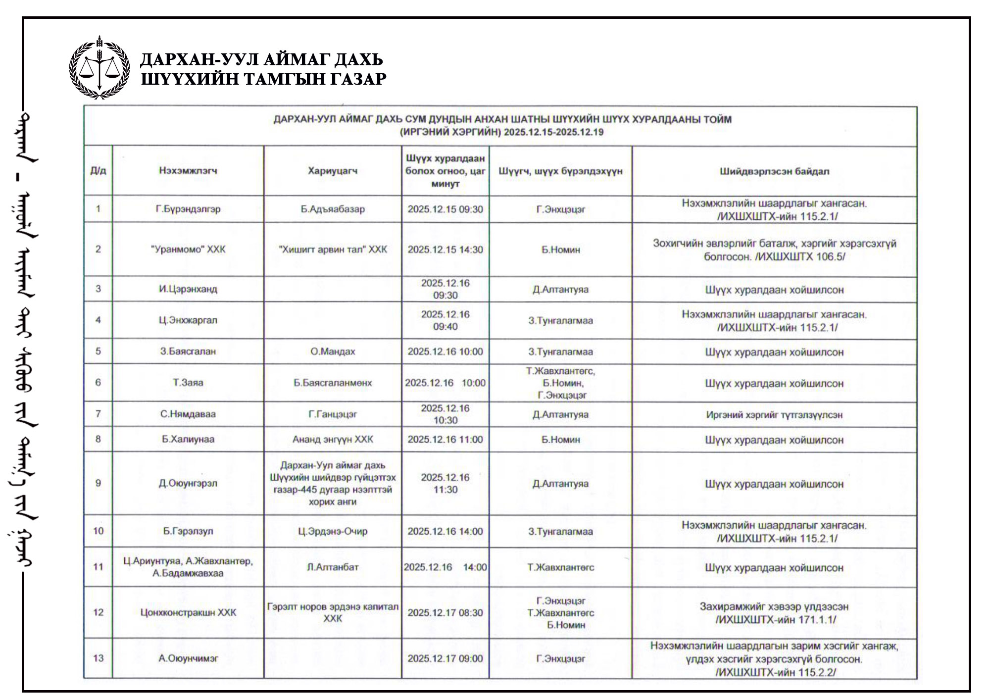 ШҮҮХ ХУРАЛДААНЫ ТОВ /Иргэний хэргийн анхан шатны шүүх 2025.12.15-12.19/