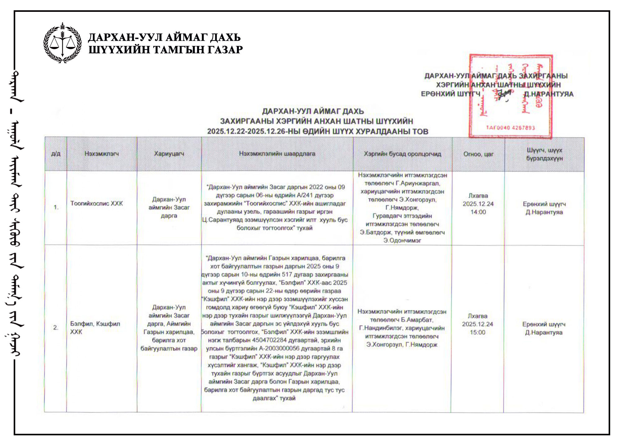 ШҮҮХ ХУРАЛДААНЫ ТОВ /Иргэний хэргийн анхан шатны шүүх 2025.12.22-12.26/