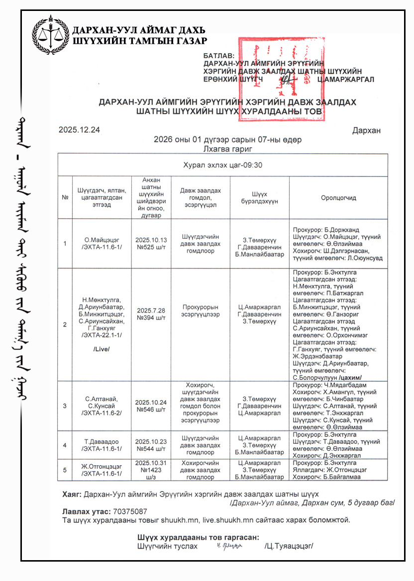 ШҮҮХ ХУРАЛДААНЫ ТОВ /ДАРХАН-УУЛ АЙМГИЙН ИРГЭНИЙ ХЭРГИЙН ДАВЖ ЗААЛДАХ ШАТНЫ ШҮҮХ 2026.01.05/