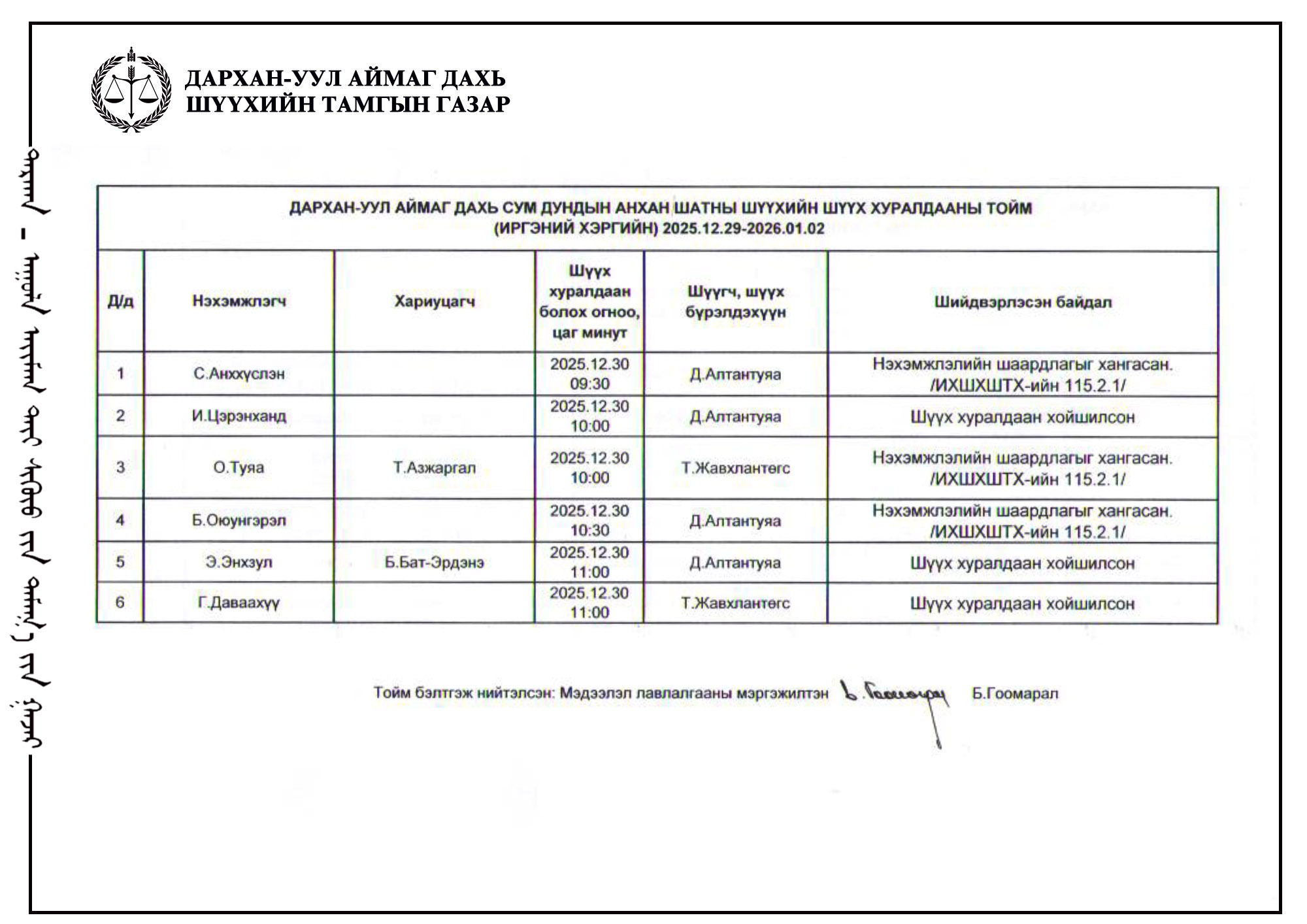 ШҮҮХ ХУРАЛДААНЫ ТОЙМ /Эрүүгийн хэргийн анхан шатны шүүх 2025.12.30-2025,01.02/