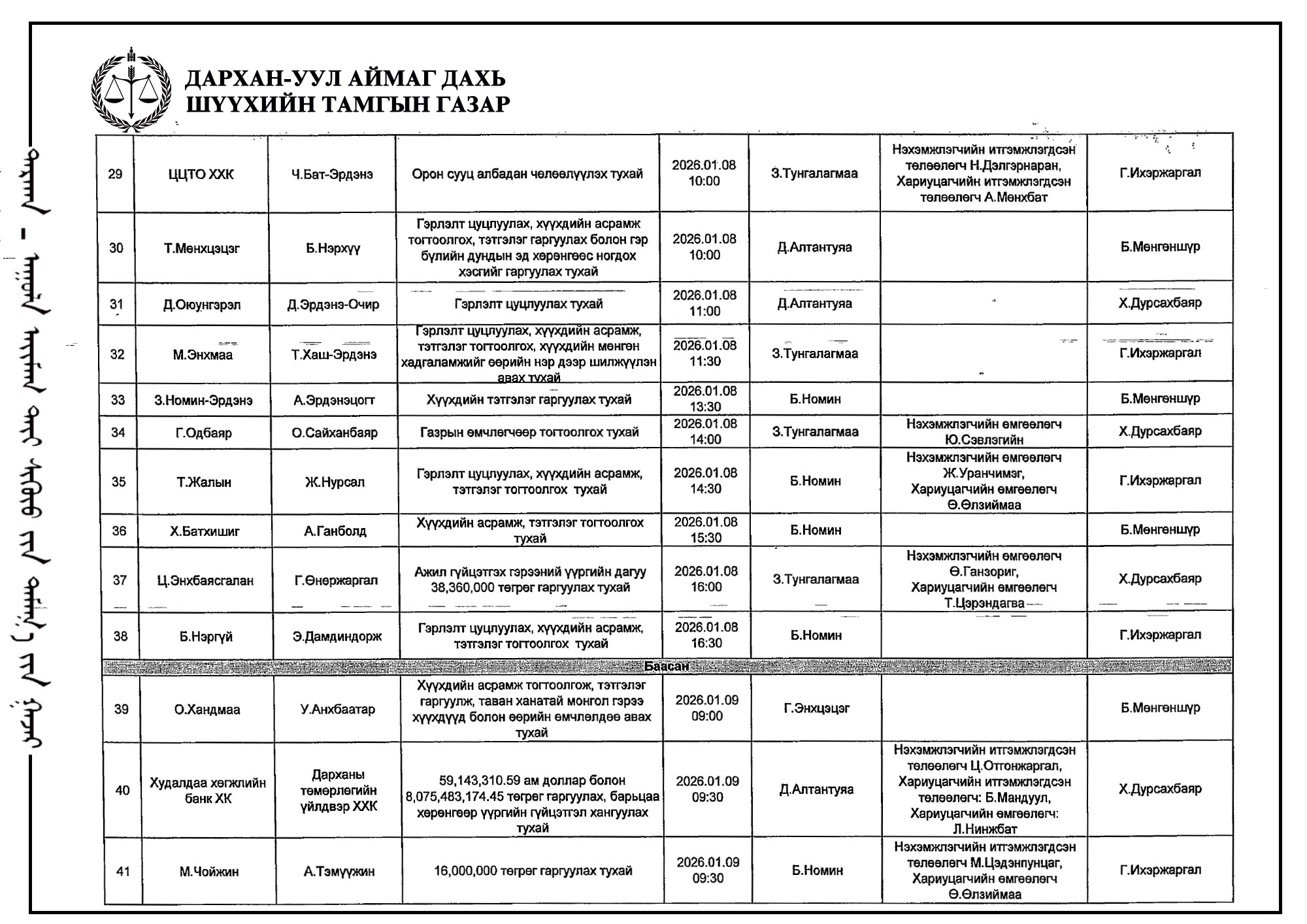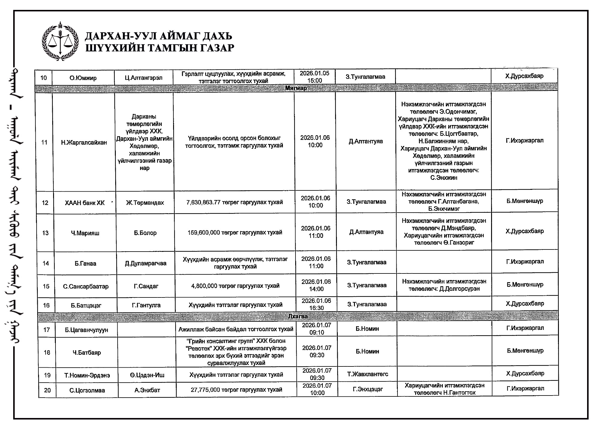 ШҮҮХ ХУРАЛДААНЫ ТОВ /Иргэний хэргийн анхан шатны шүүх 2026.01.05-01.09/