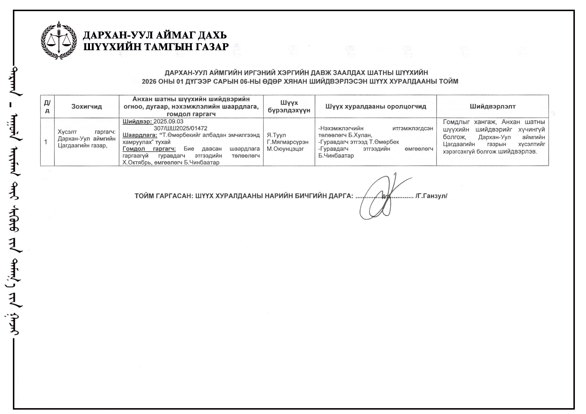 ДАРХАН-УУЛ АЙМГИЙН ИРГЭНИЙ ХЭРГИЙН ДАВЖ ЗААЛДАХ ШАТНЫ ШҮҮХИЙН 2025 ОНЫ /БҮТЭН ЖИЛИЙН ТАЙЛАН/