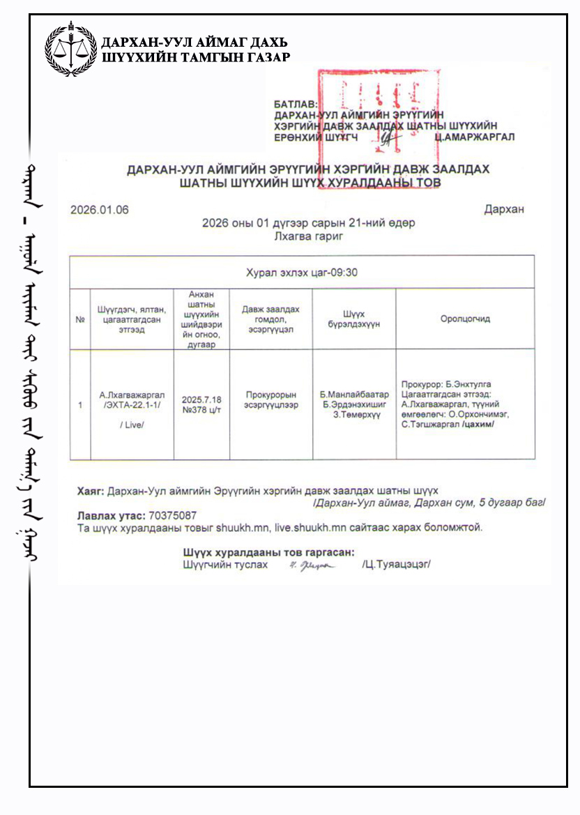 ШҮҮХ ХУРАЛДААНЫ ТОВ /Эрүүгийн хэргийн давж заалдах шатны шүүх 2026.01.21/