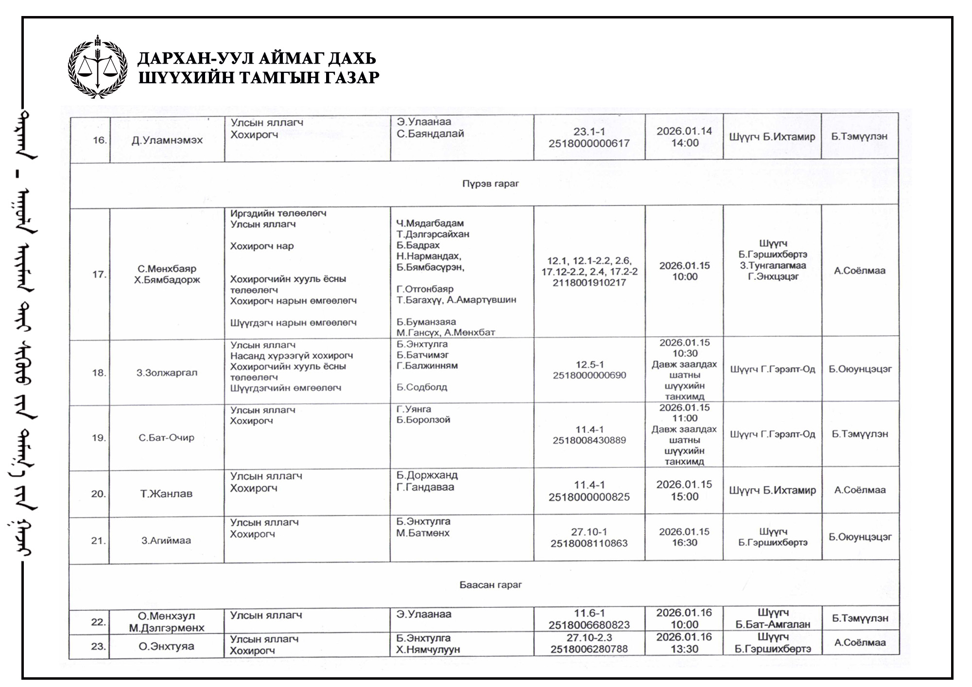 ШҮҮХ ХУРАЛДААНЫ ТОЙМ /Эрүүгийн хэргийн анхан шатны шүүх 2026.01.05-01.09/
