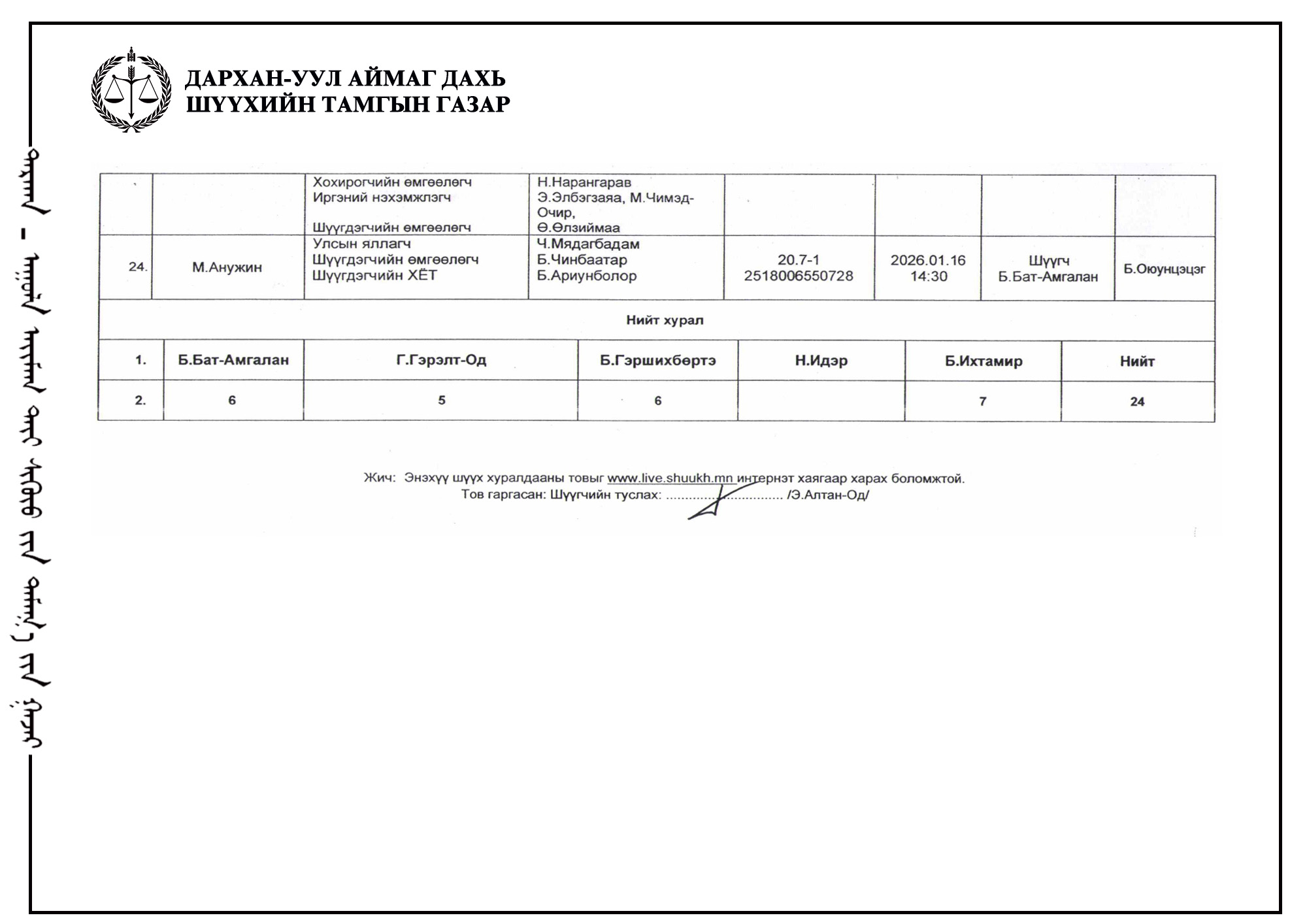 ШҮҮХ ХУРАЛДААНЫ ТОЙМ /Захиргааны хэргийн анхан шатны шүүх 2026.01.05/