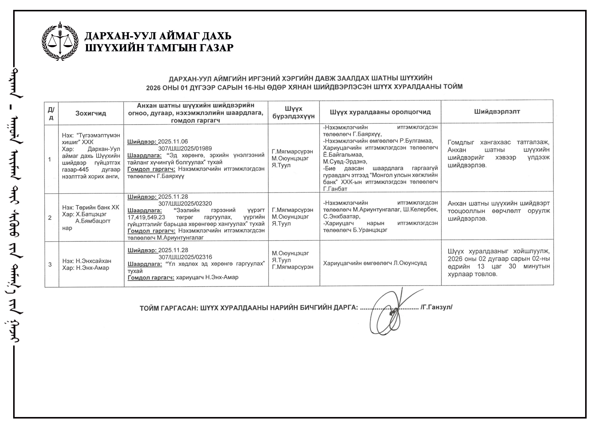 ШҮҮХ ХУРАЛДААНЫ ТОВ /ДАРХАН-УУЛ АЙМГИЙН ИРГЭНИЙ ХЭРГИЙН ДАВЖ ЗААЛДАХ ШАТНЫ ШҮҮХ 2026.02.11/