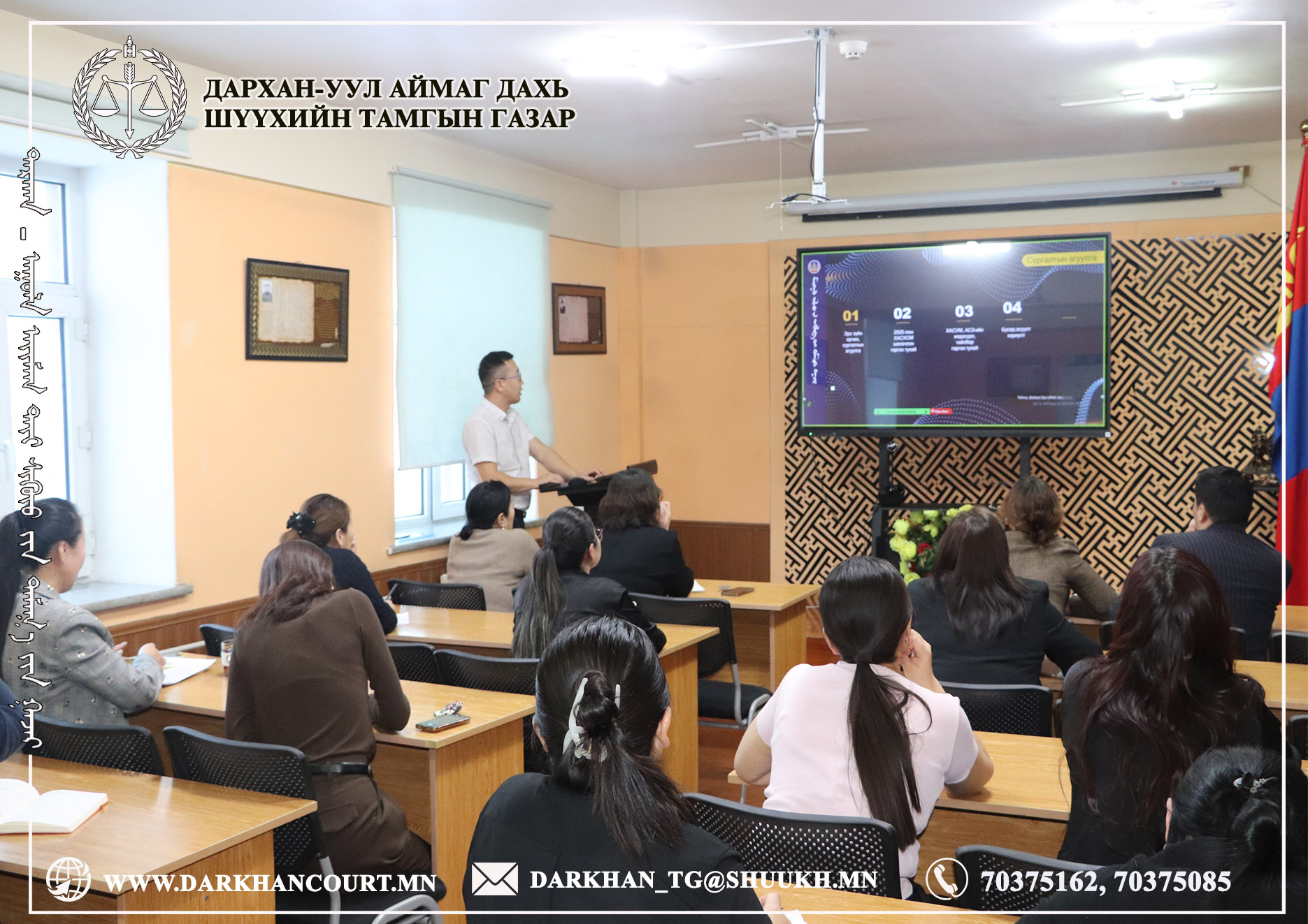 2026-01-22 | 14Шүүгч, шүүхийн захиргааны ажилтнуудад Хувийн ашиг сонирхол, хөрөнгө орлогын мэдүүлэг гаргахад анхаарах асуудал, авлига, ашиг сонирхлын зөрчлөөс урьдчилан сэргийлэх талаар шүүхийн мэдээллийн технологийн мэргэжилтэн М.Баярмагнай сургалт зохион байгуулав.