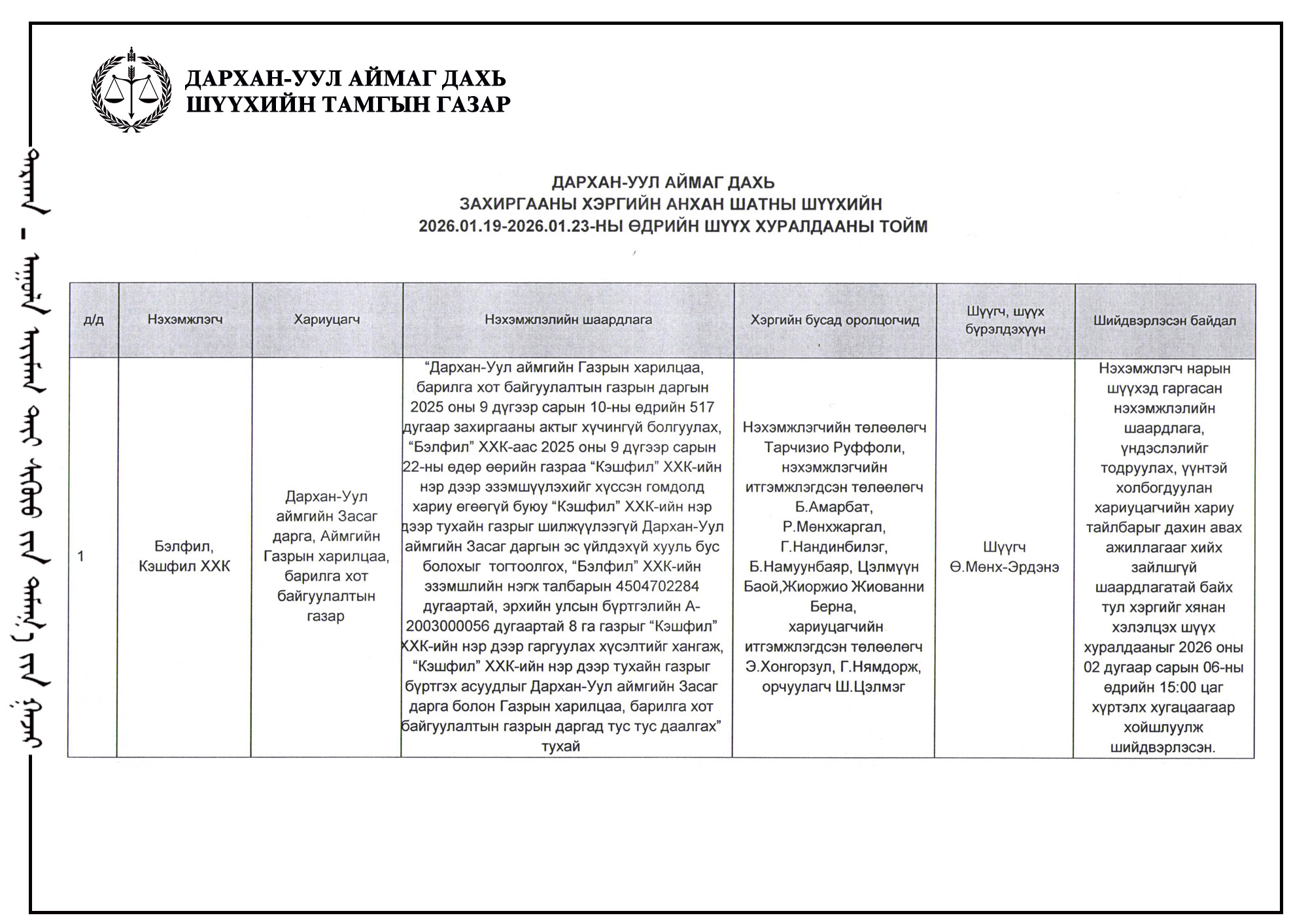 ШҮҮХ ХУРАЛДААНЫ ТОВ /ДАРХАН-УУЛ АЙМАГ ДАХЬ ЗАХИРГААНЫ ХЭРГИЙН АНХАН ШАТНЫ ШҮҮХ 2026.01.19-01.23/