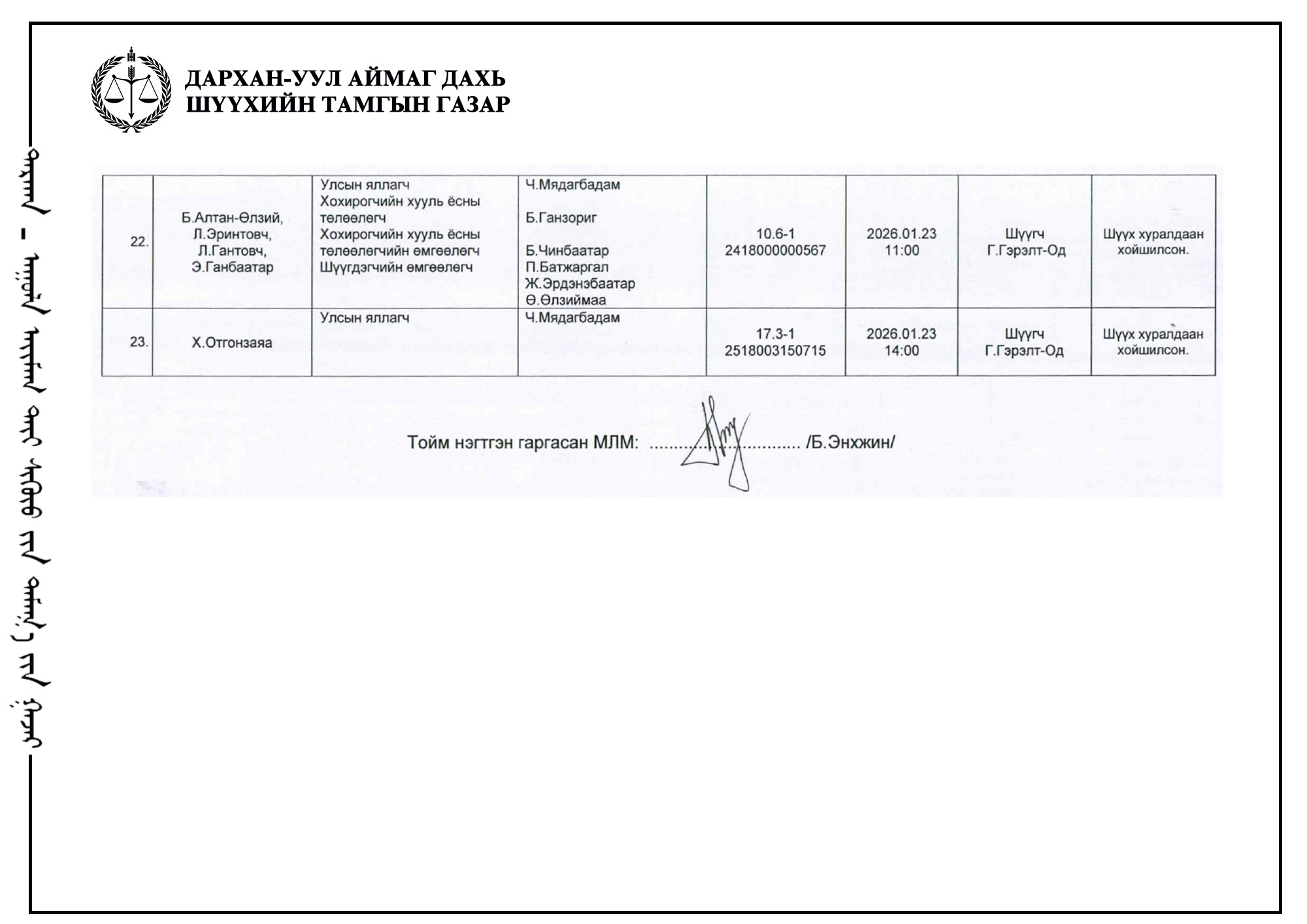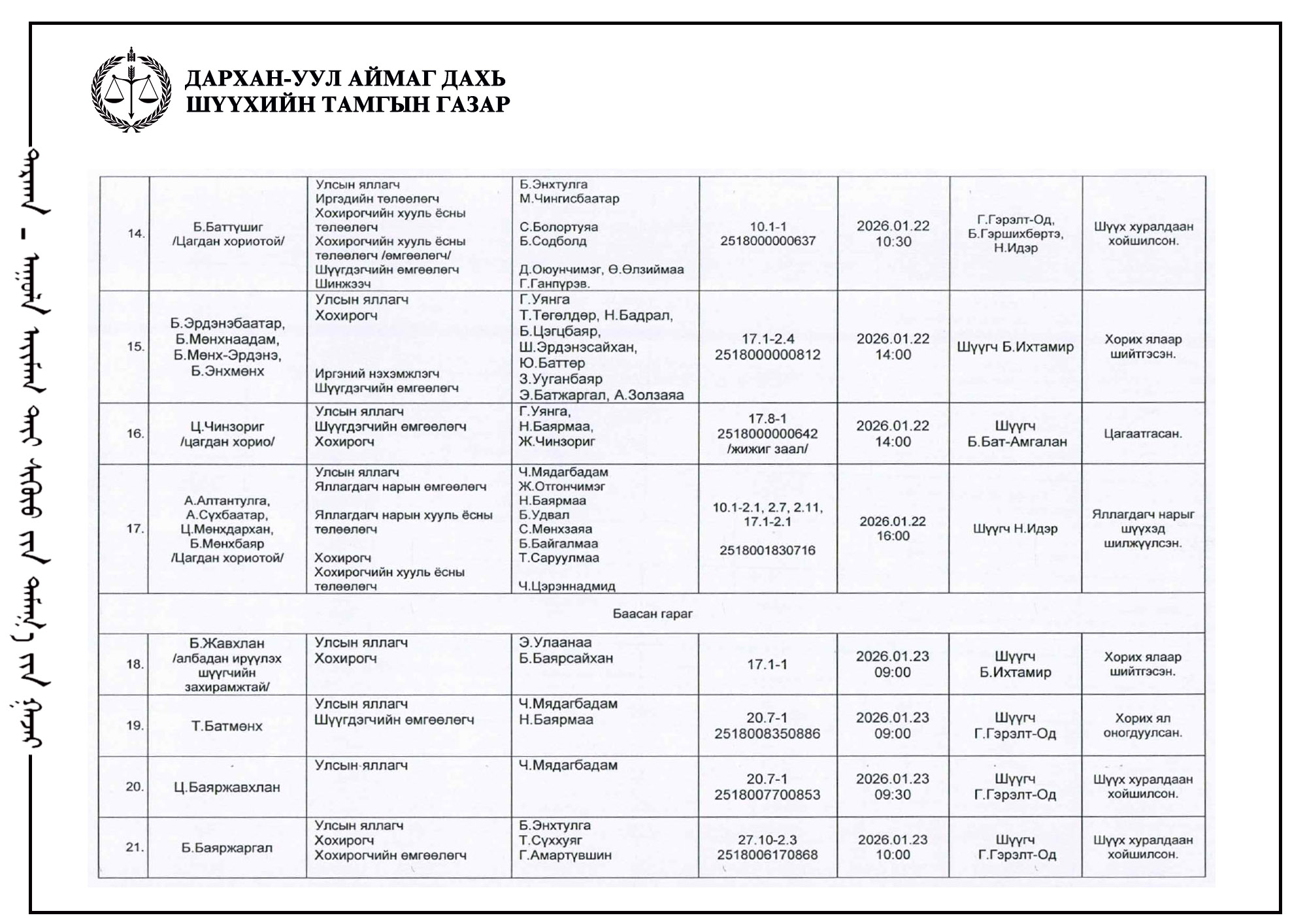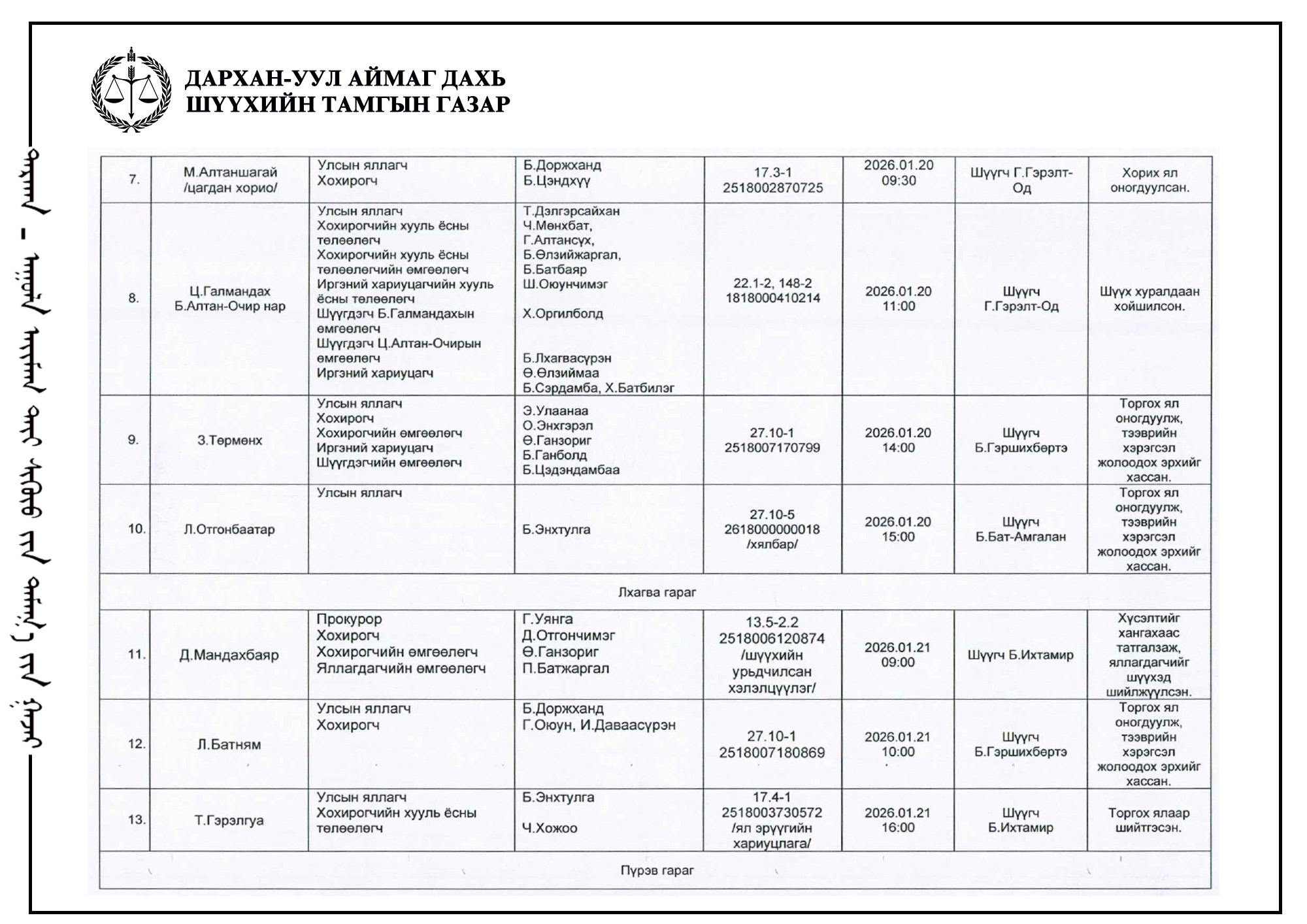 ШҮҮХ ХУРАЛДААНЫ ТОВ /ДАРХАН-УУЛ АЙМАГ ДАХЬ ЗАХИРГААНЫ ХЭРГИЙН АНХАН ШАТНЫ ШҮҮХ 2026.01.19-01.23/
