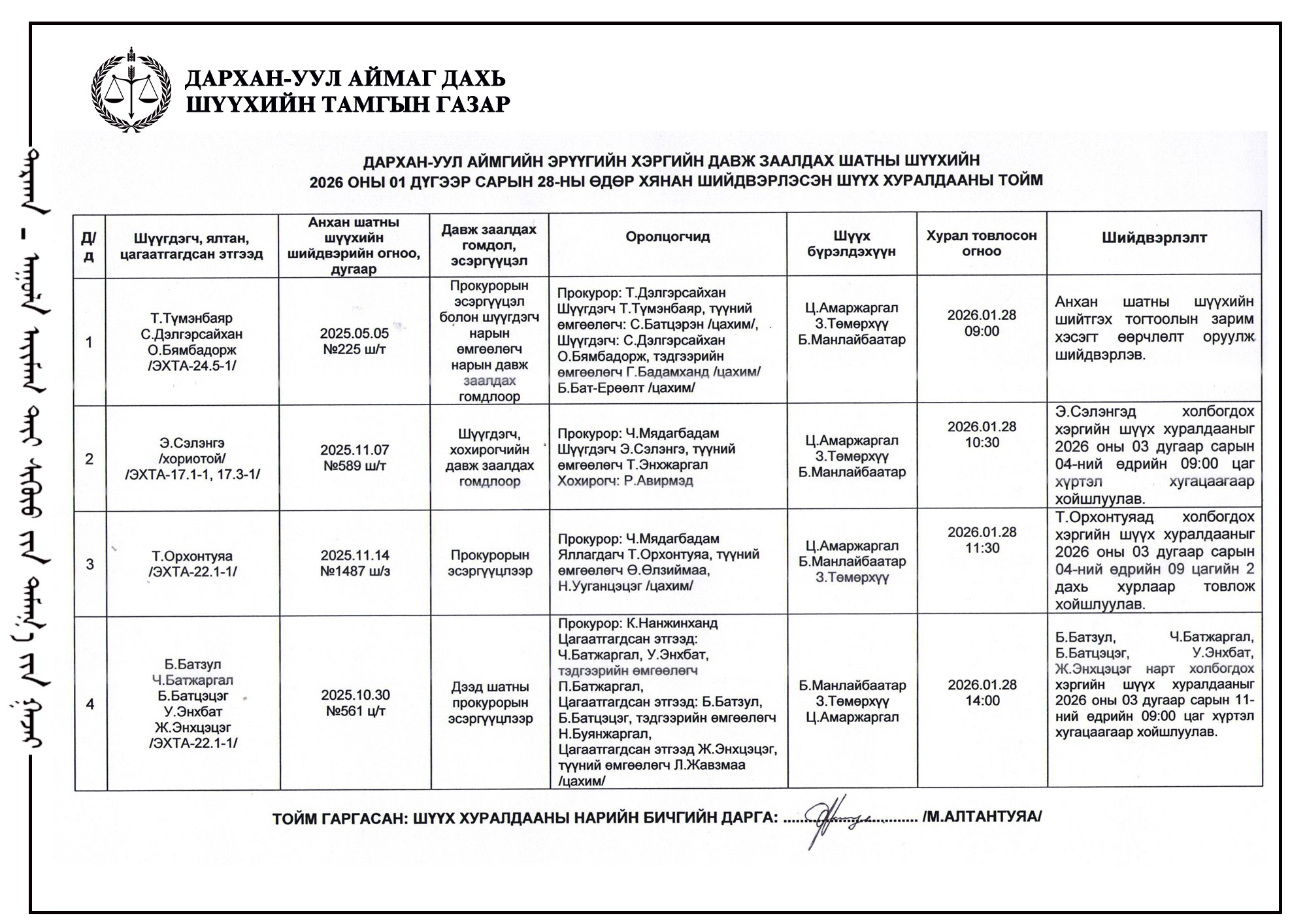 ШҮҮХ ХУРАЛДААНЫ ТОВ /ДАРХАН-УУЛ АЙМАГ ДАХЬ ЗАХИРГААНЫ ХЭРГИЙН АНХАН ШАТНЫ ШҮҮХ 2026.01.26-01.30/