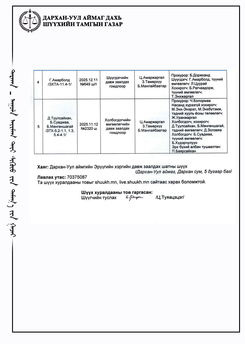 ШҮҮХ ХУРАЛДААНЫ ТОВ /ДАРХАН-УУЛ АЙМГИЙН ЭРҮҮГИЙН ХЭРГИЙН ДАВЖ ЗААЛДАХ ШАТНЫ ШҮҮХ 2026.03.04/