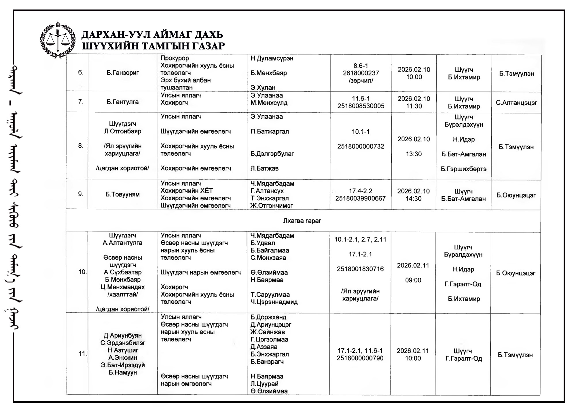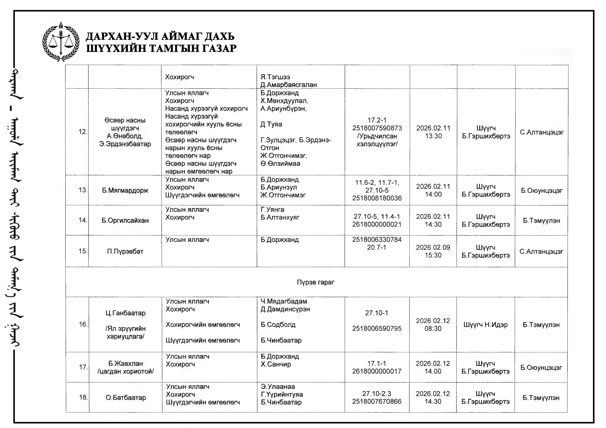 ШҮҮХ ХУРАЛДААНЫ ТОВ /ДАРХАН-УУЛ АЙМГИЙН ИРГЭНИЙ ХЭРГИЙН АНХАН ШАТНЫ ШҮҮХ 2026.02.09-2026.02.13/