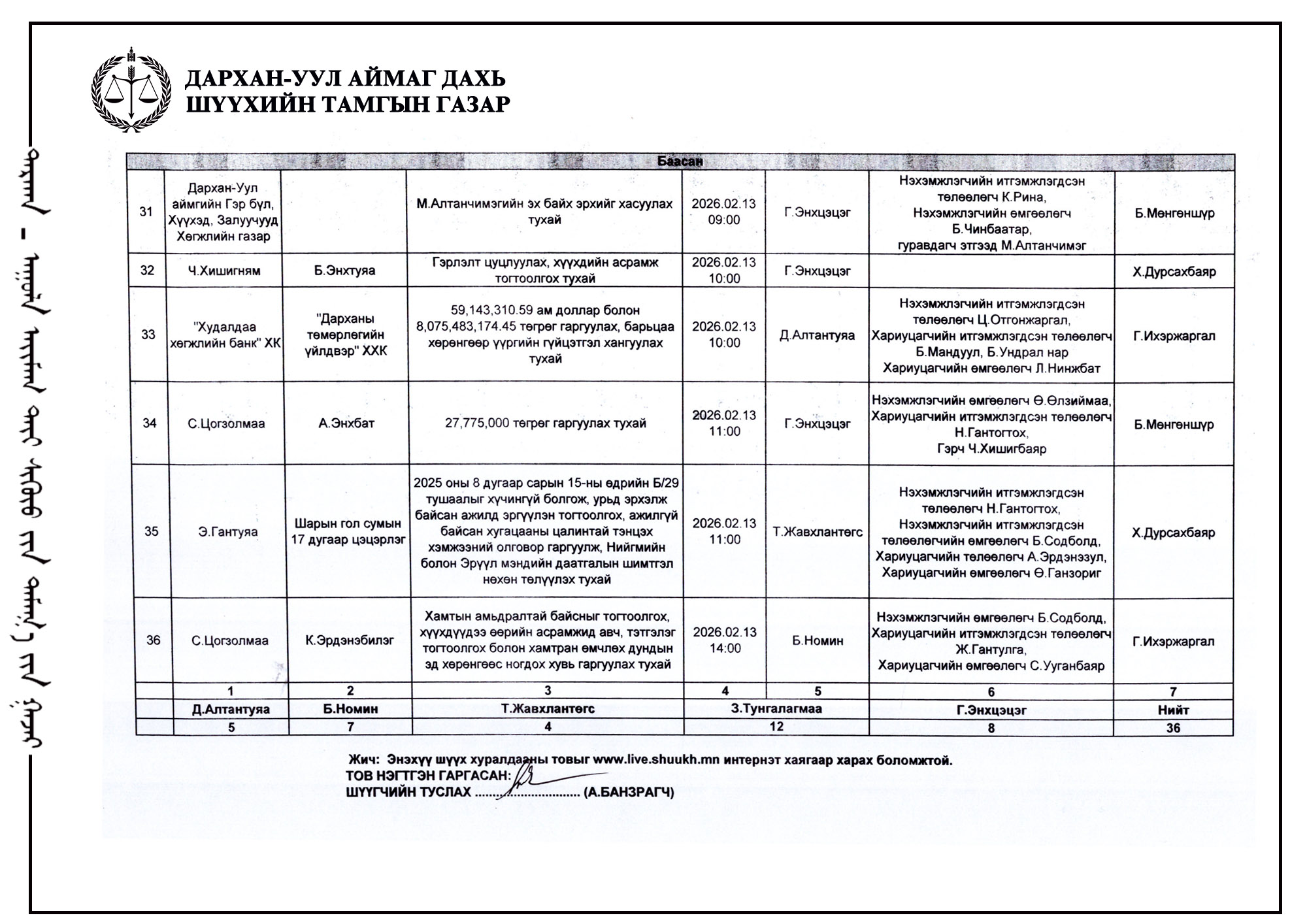 ШҮҮХ ХУРАЛДААНЫ ТОВ /ДАРХАН-УУЛ АЙМГИЙН ИРГЭНИЙ ХЭРГИЙН АНХАН ШАТНЫ ШҮҮХ 2026.02.09-2026.02.13/