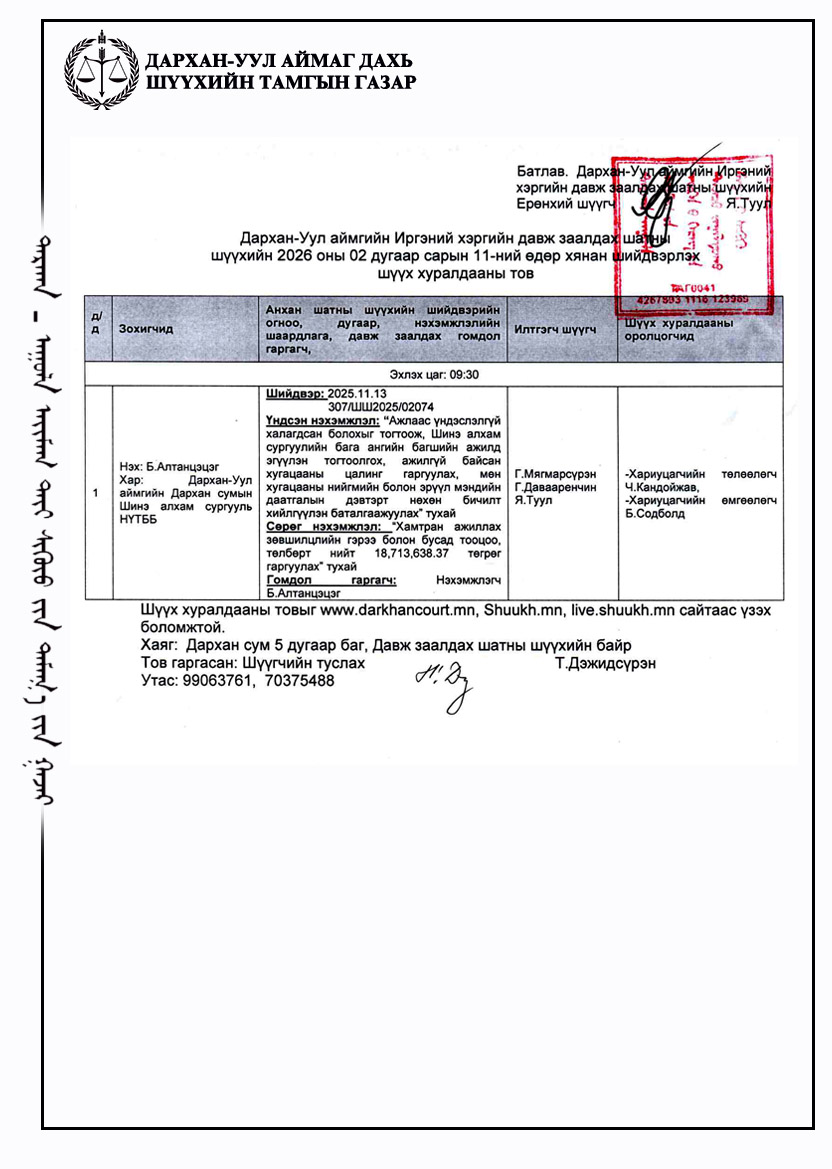 ШҮҮХ ХУРАЛДААНЫ ТОВ /ДАРХАН-УУЛ АЙМГИЙН ИРГЭНИЙ ХЭРГИЙН АНХАН ШАТНЫ ШҮҮХ 2026.02.09-2026.02.13/