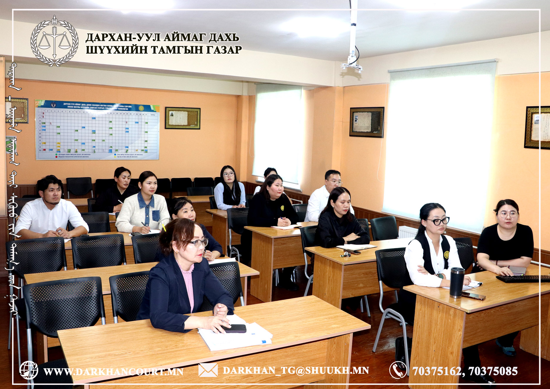 2026-02-13 | 44Дархан-Уул аймаг дахь Захиргааны хэргийн анхан шатны шүүхийн шүүгч Ө.Мөнх-Эрдэнэ, шүүгчийн туслах Б.Гоомарал нар Монгол Улсын Дээд шүүхийн Захиргааны хэргийн танхимын 2025 оны 04 дүгээр сарын 01-ний өдрөөс 2025 оны 06 дугаар сарын 30-ны өдрийг хүртэлх хугацаан дахь тогтоолыг маргааны төрлөөр судлан хэлэлцүүлэг зохион байгууллаа.