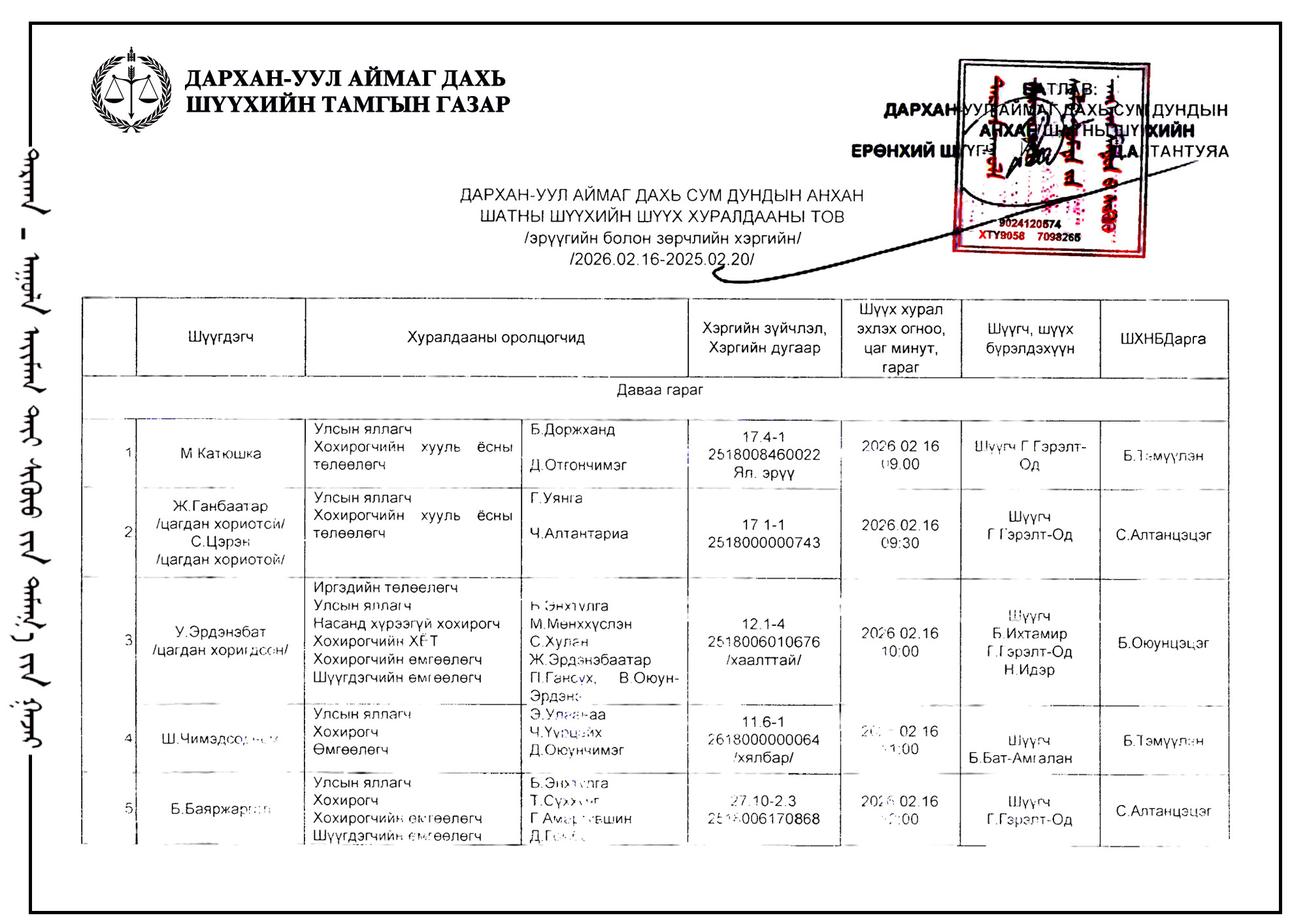 ШҮҮХ ХУРАЛДААНЫ ТОВ /ДАРХАН-УУЛ АЙМАГ ДАХЬ ЗАХИРГААНЫ ХЭРГИЙН АНХАН ШАТНЫ ШҮҮХ 2026.02.16-02.20/