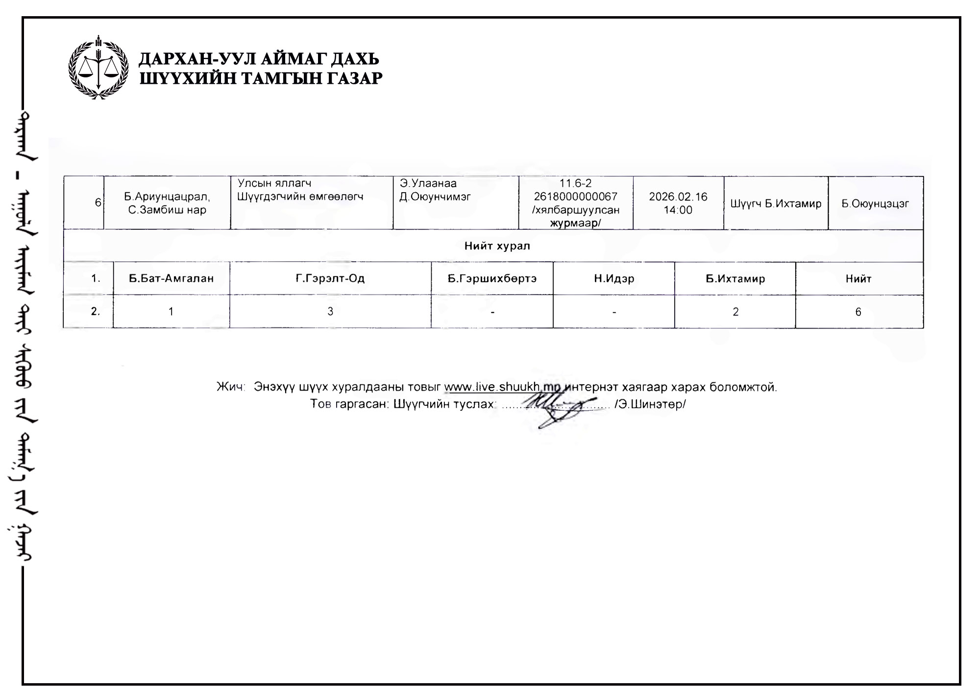 ЭРҮҮГИЙН БОЛОН ЗӨРЧЛИЙН ХЭРГИЙН ШҮҮХ ХУРАЛДААНЫ ТОВ /ДАРХАН-УУЛ АЙМАГ ДАХЬ СУМ ДУНДЫН АНХАН ШАТНЫ ШҮҮХ 2026.02.16-2026.02.20/