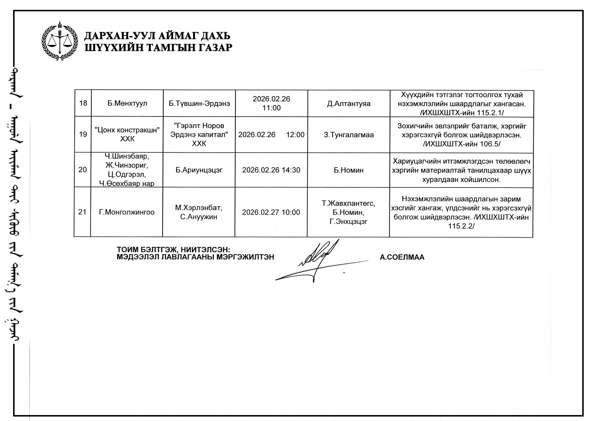 ЭРҮҮГИЙН БОЛОН ЗӨРЧЛИЙН ХЭРГИЙН ШҮҮХ ХУРАЛДААНЫ ТОВ /ДАРХАН-УУЛ АЙМАГ ДАХЬ СУМ ДУНДЫН АНХАН ШАТНЫ ШҮҮХ 2026.02.23-2026.02.27/
