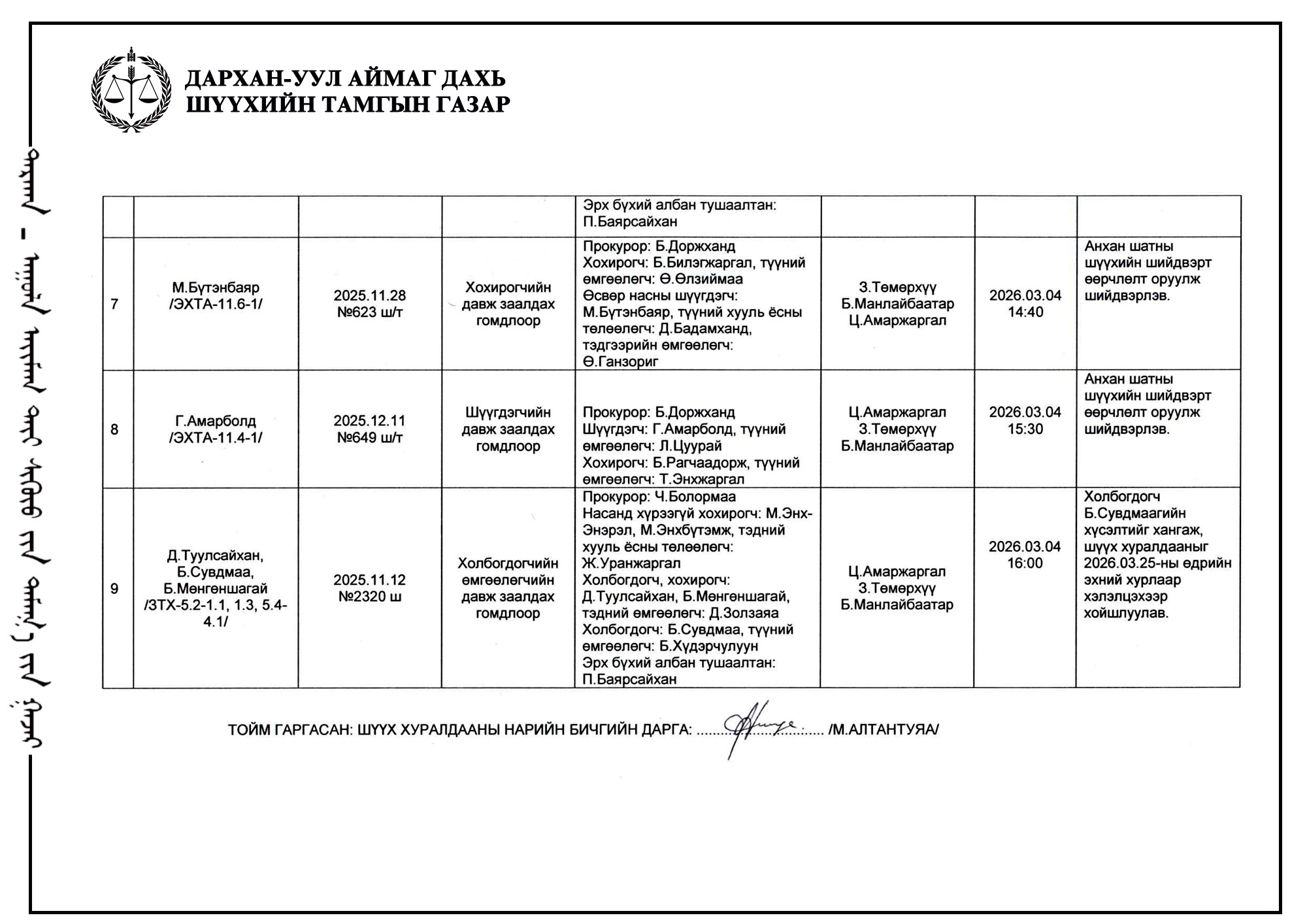 ШҮҮХ ХУРАЛДААНЫ ТОВ /ДАРХАН-УУЛ АЙМГИЙН ИРГЭНИЙ ХЭРГИЙН АНХАН ШАТНЫ ШҮҮХ 2026.03.02-2026.03.06/