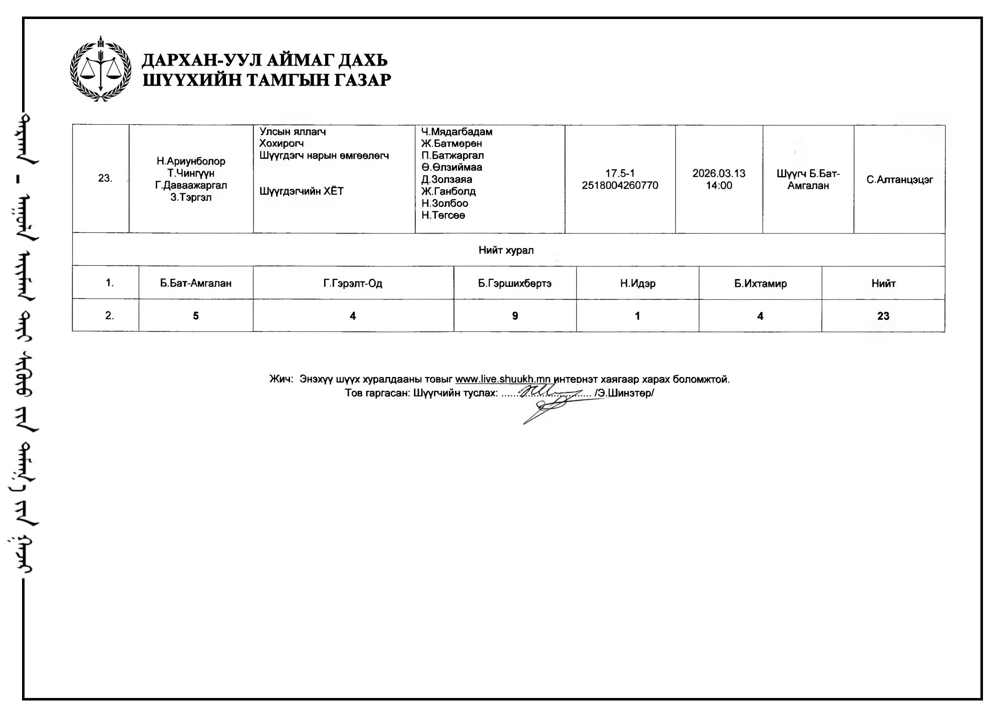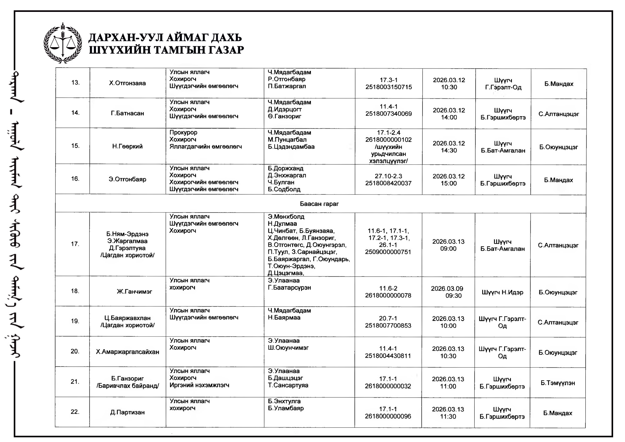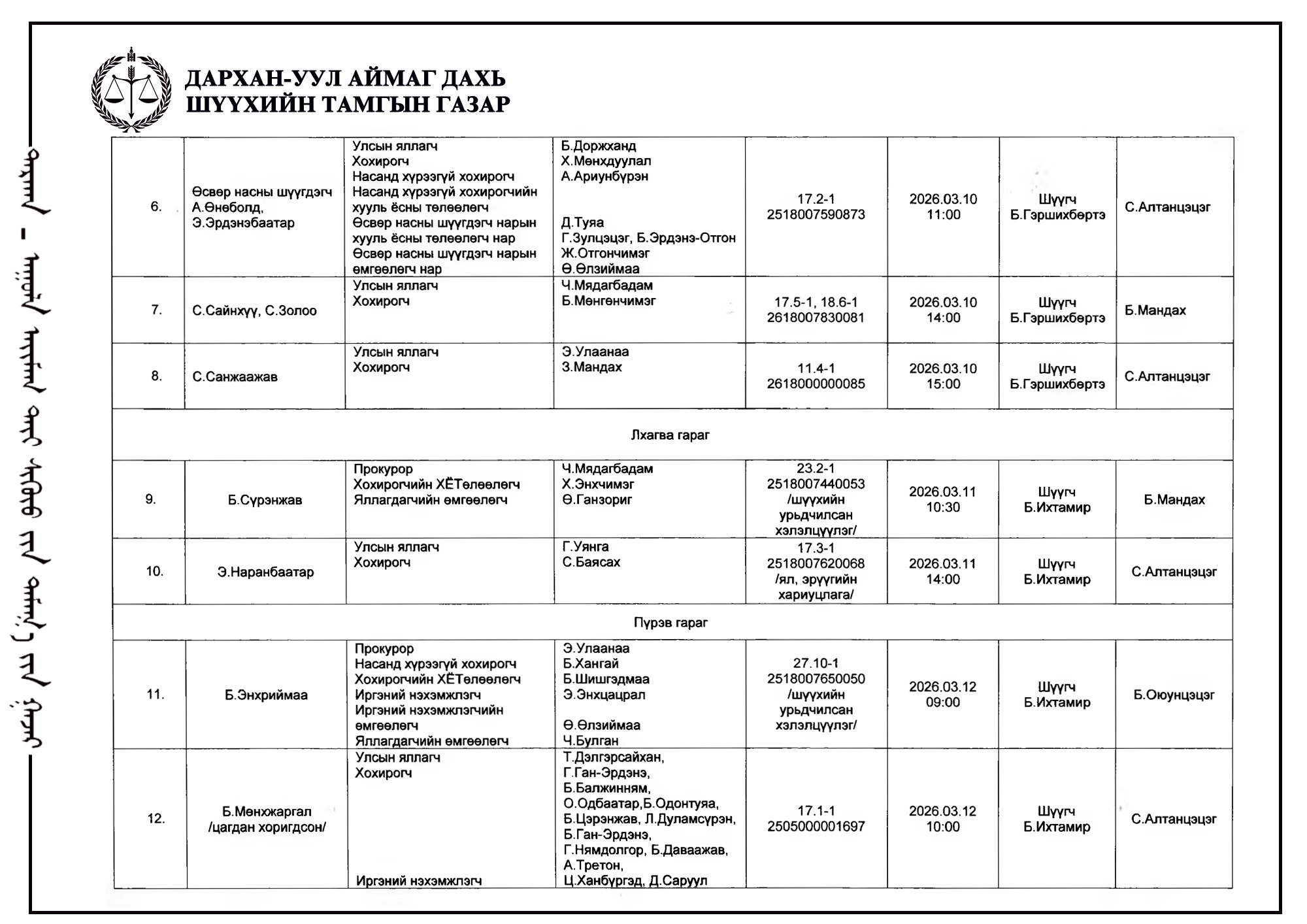ШҮҮХ ХУРАЛДААНЫ ТОВ /ДАРХАН-УУЛ АЙМАГ ДАХЬ ЗАХИРГААНЫ ХЭРГИЙН АНХАН ШАТНЫ ШҮҮХ 2026.03.09-2026.03.13/