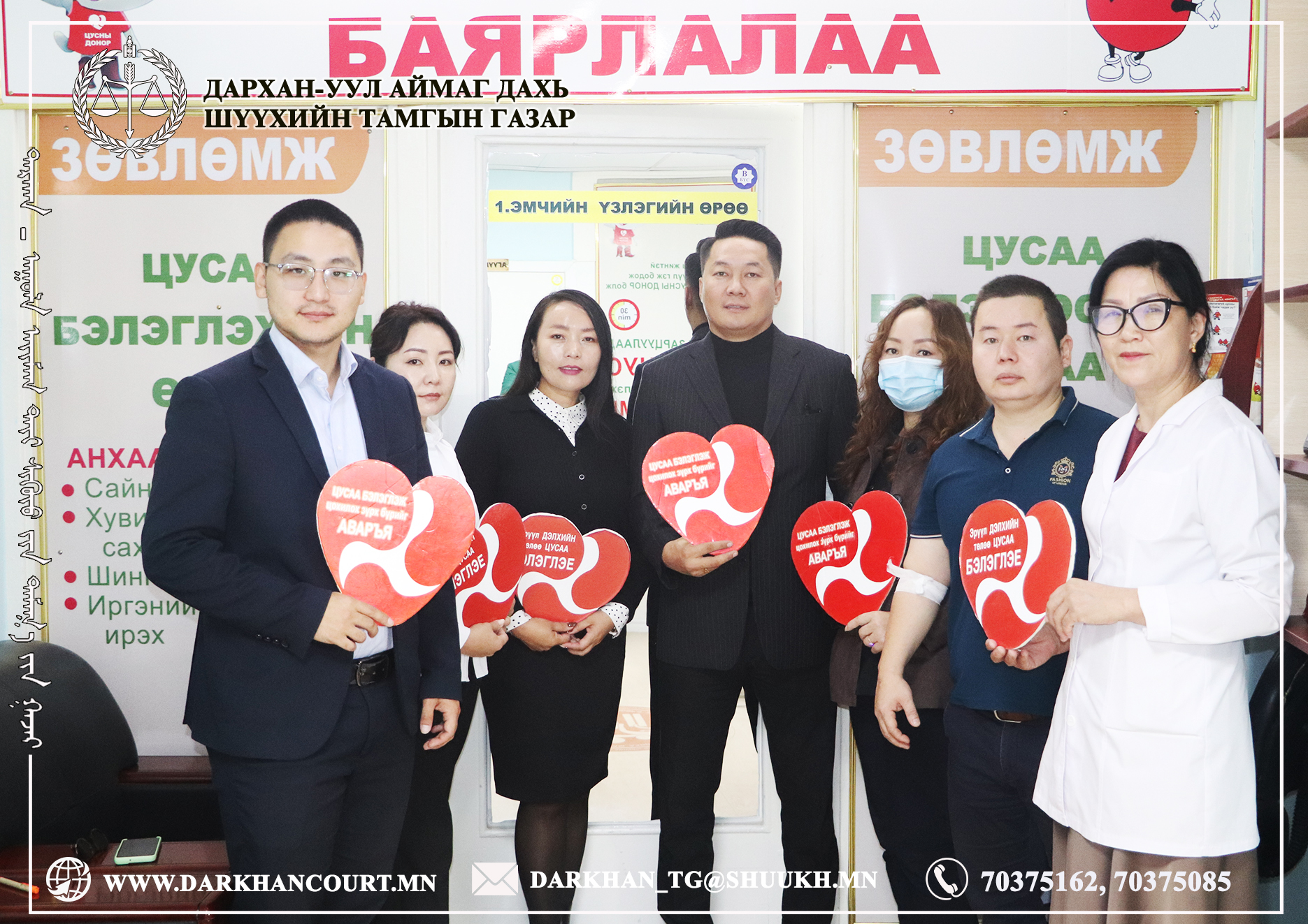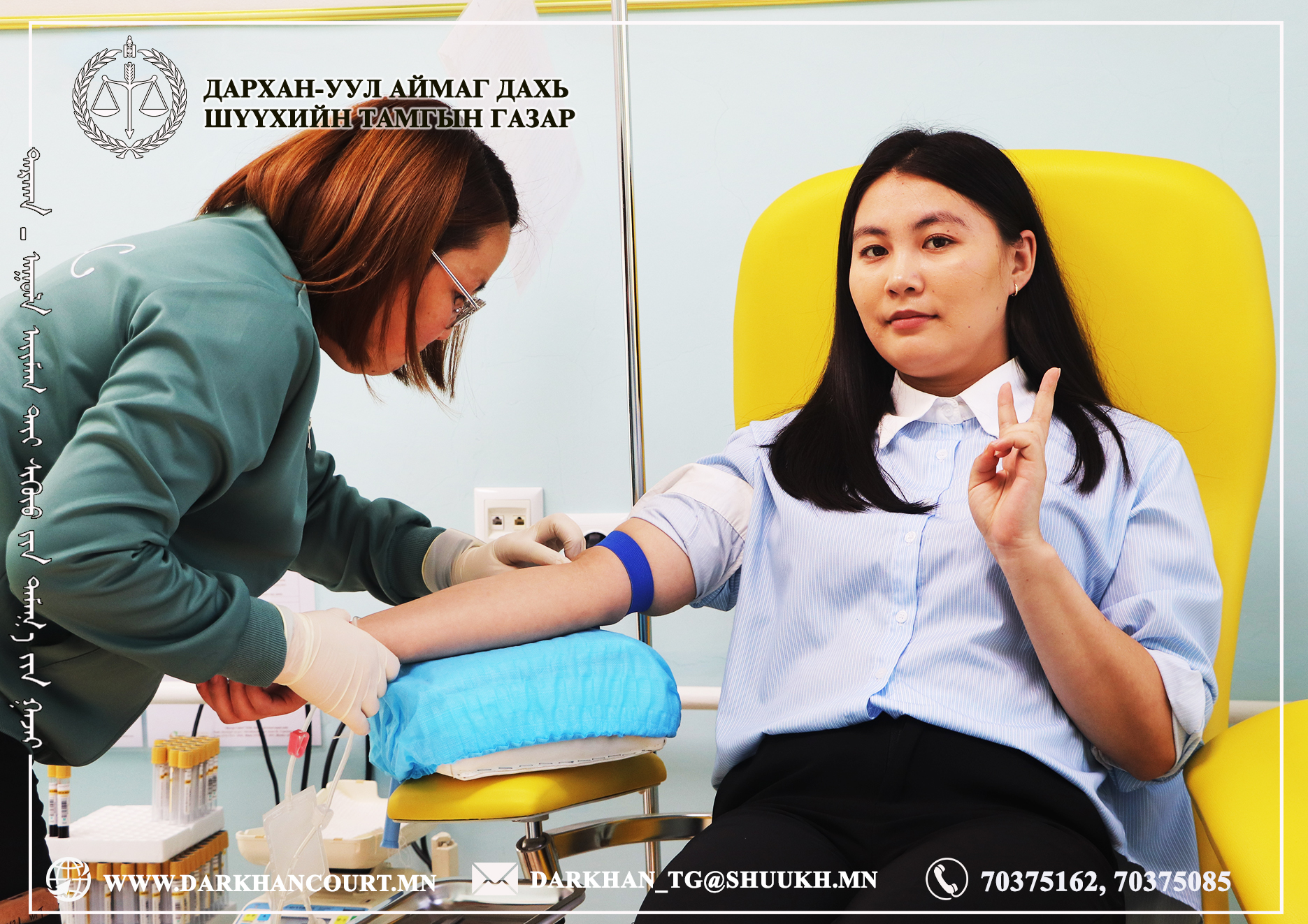 Тус шүүхийн хэмжээнд анх удаа болон 75 удаа цусаа хандивласан шүүгч, ажилтнууд байдаг бөгөөд улс үндэстэн бүхэнд цус, цусан бүтээгдэхүүний хангалттай нөөцтэй байх нь хүн амын эрүүл мэндийг сахин хамгаалах их үйлсийн үнэ цэнтэй салшгүй холбоотой тул иргэн, байгууллага хамт олныг цусаа хандивлах сайн үйлсэд нэгдэхийг Дархан-Уул аймаг дахь шүүхийн хамт олны зүгээс уриалж байна.