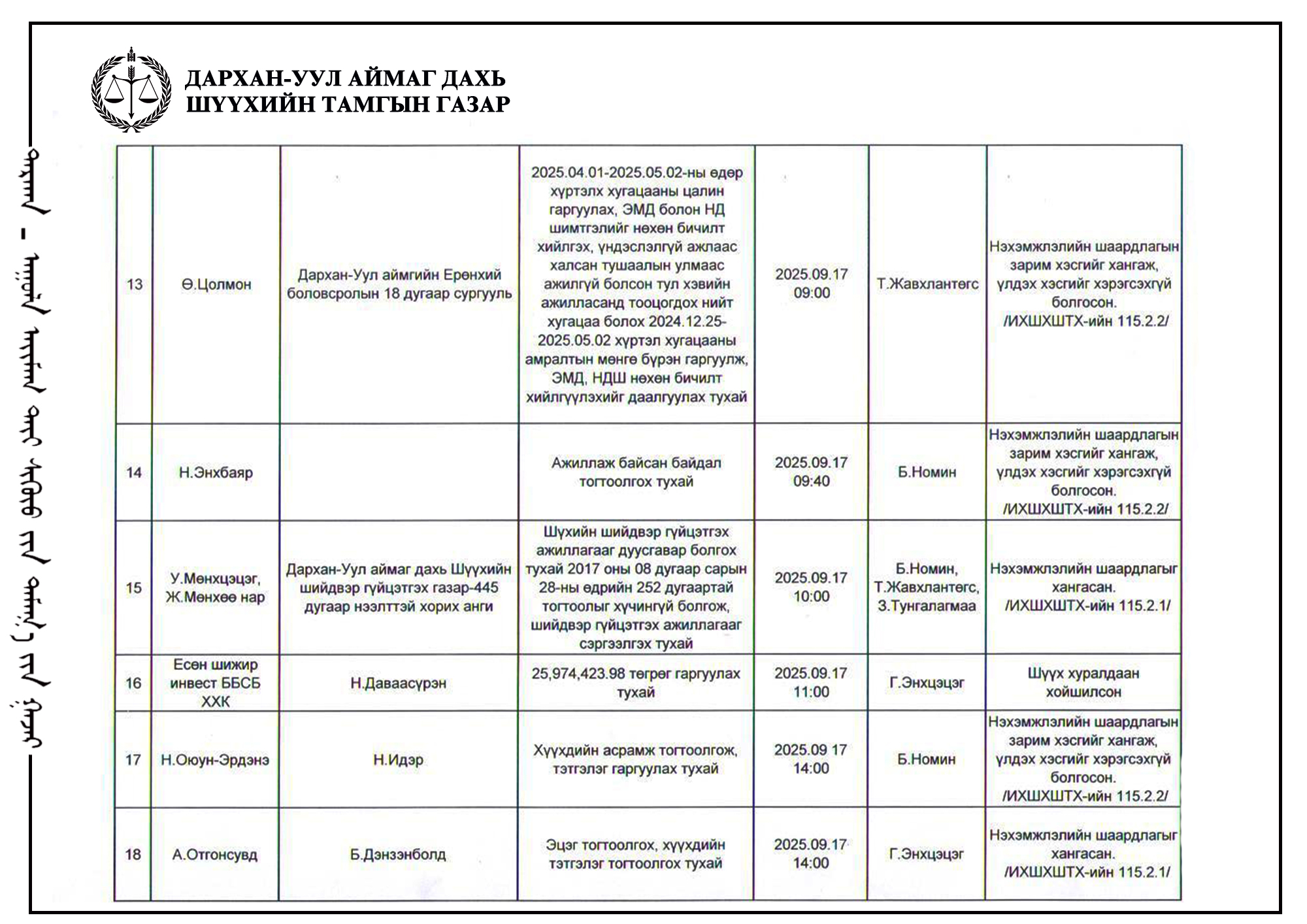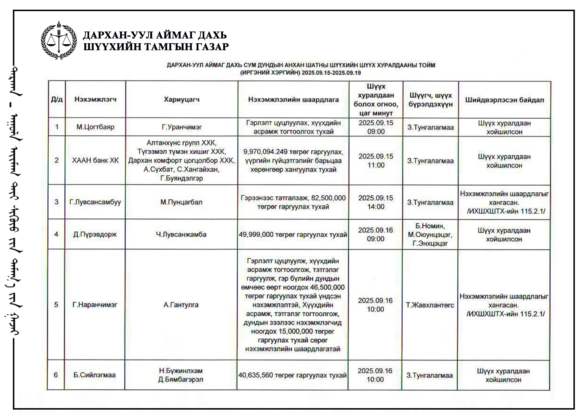 ШҮҮХ ХУРАЛДААНЫ ТОЙМ /Иргэний хэргийн анхан шатны шүүх 2025.09.15-19/