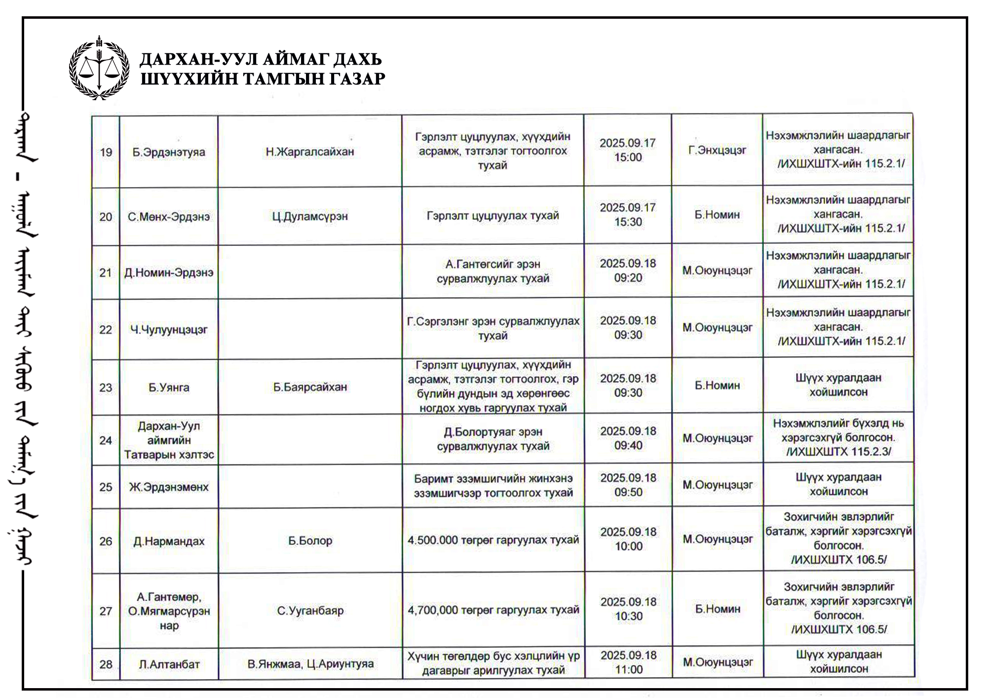 ШҮҮХ ХУРАЛДААНЫ ТОЙМ /Эрүүгийн хэргийн анхан шатны шүүх 2025.09.15-19/