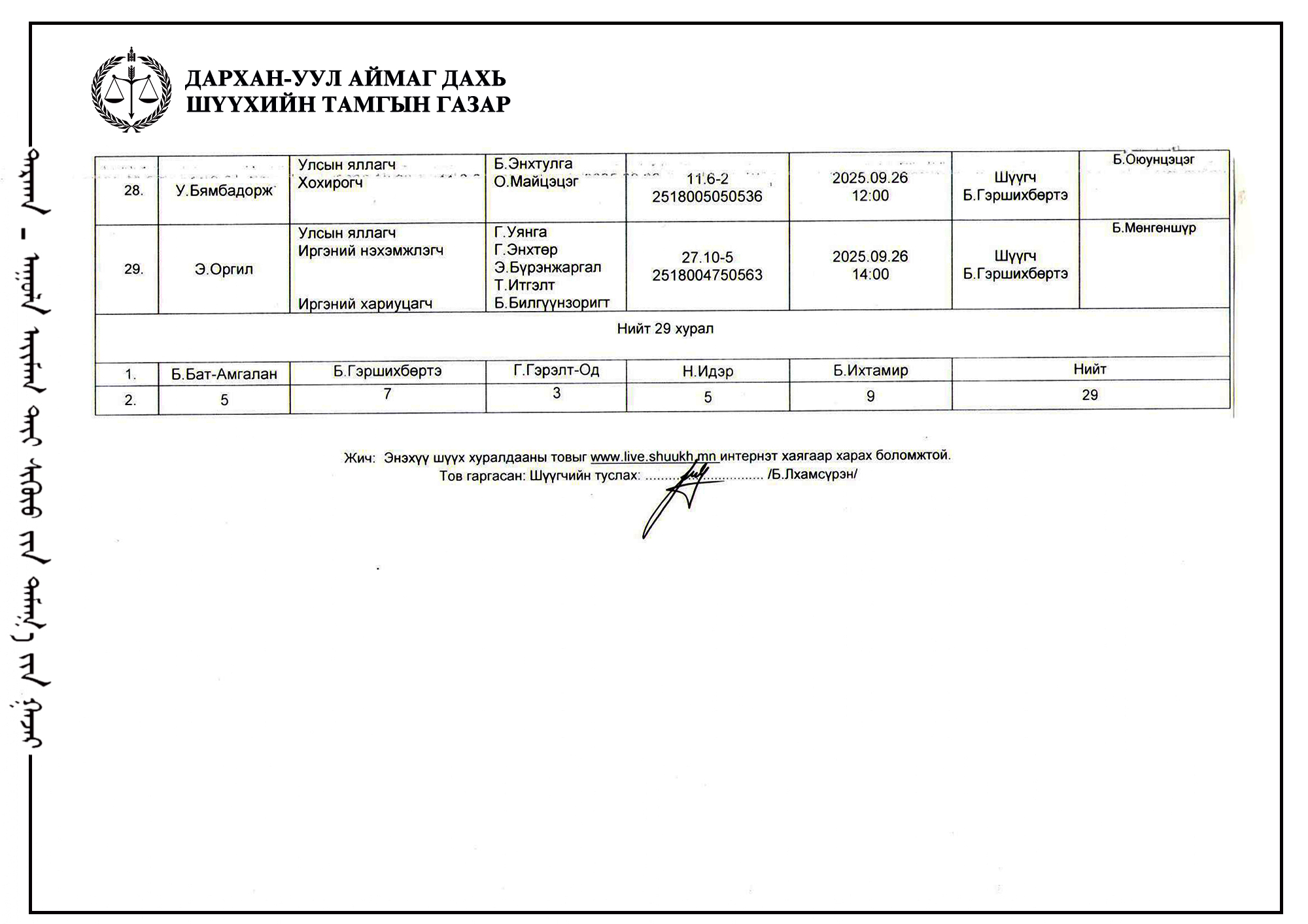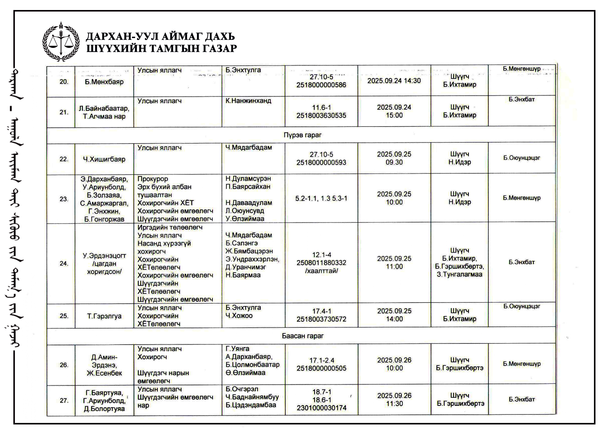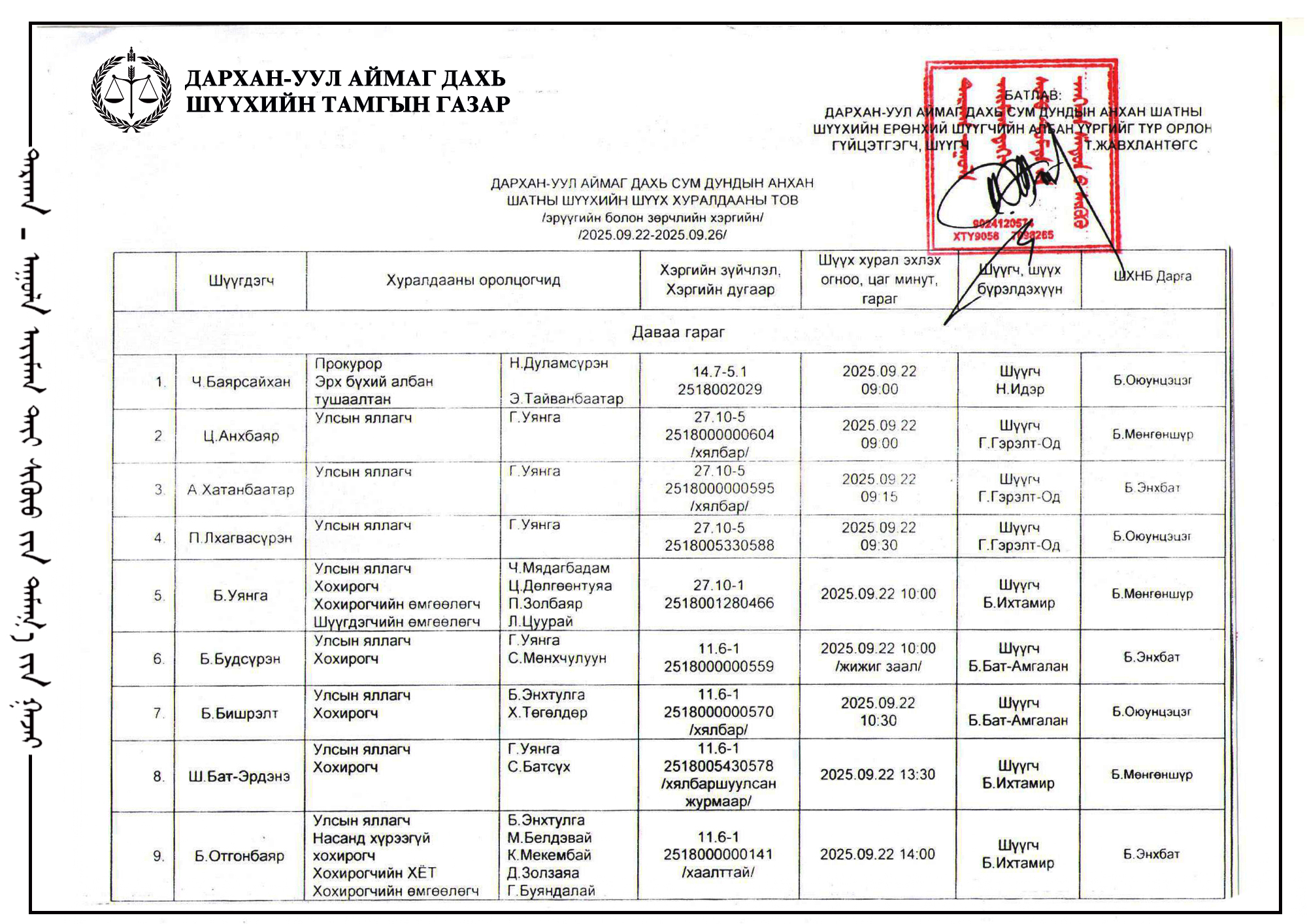 ШҮҮХ ХУРАЛДААНЫ ТОВ /Эрүүгийн хэргийн анхан шатны шүүх 2025.09.22-26/