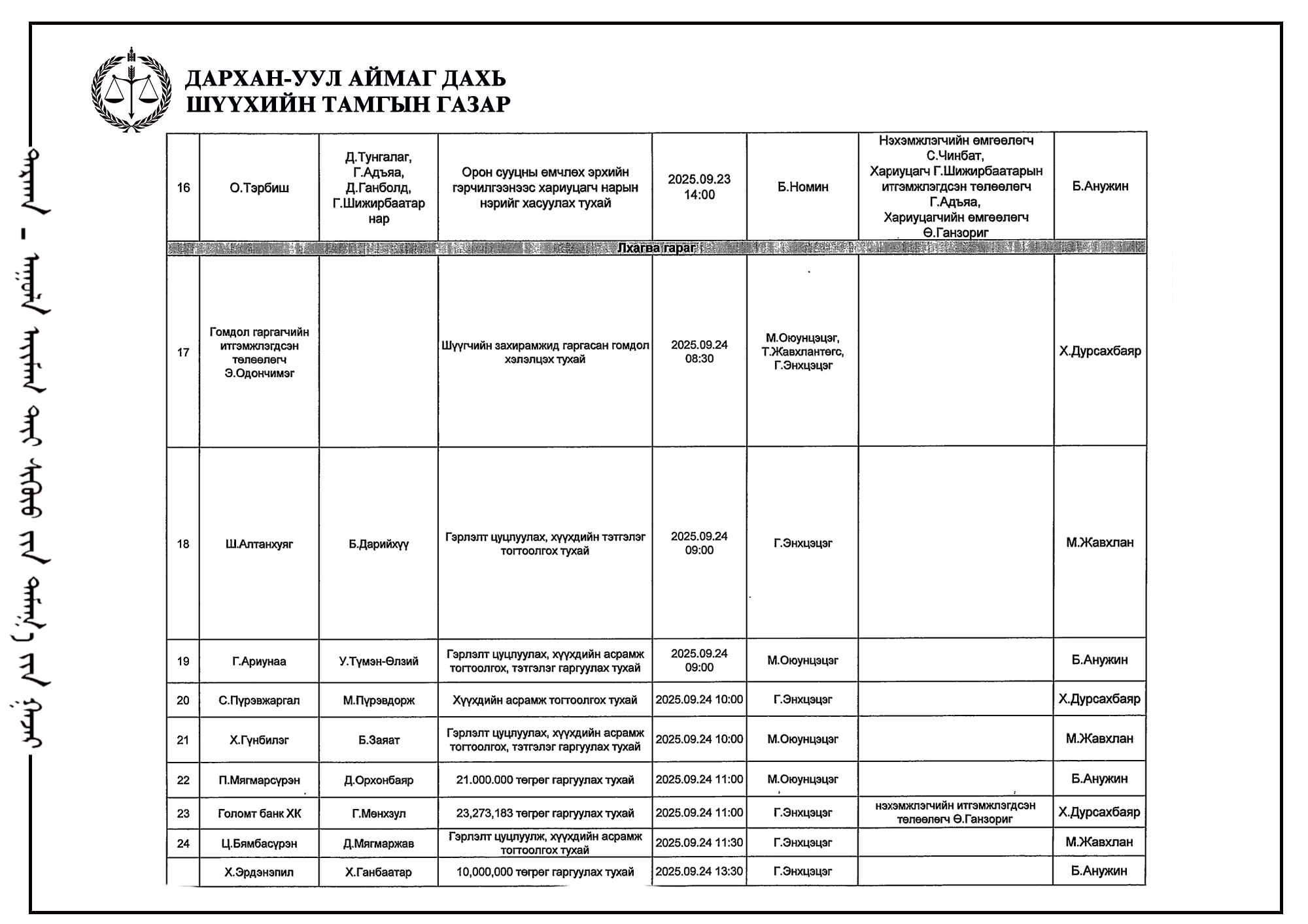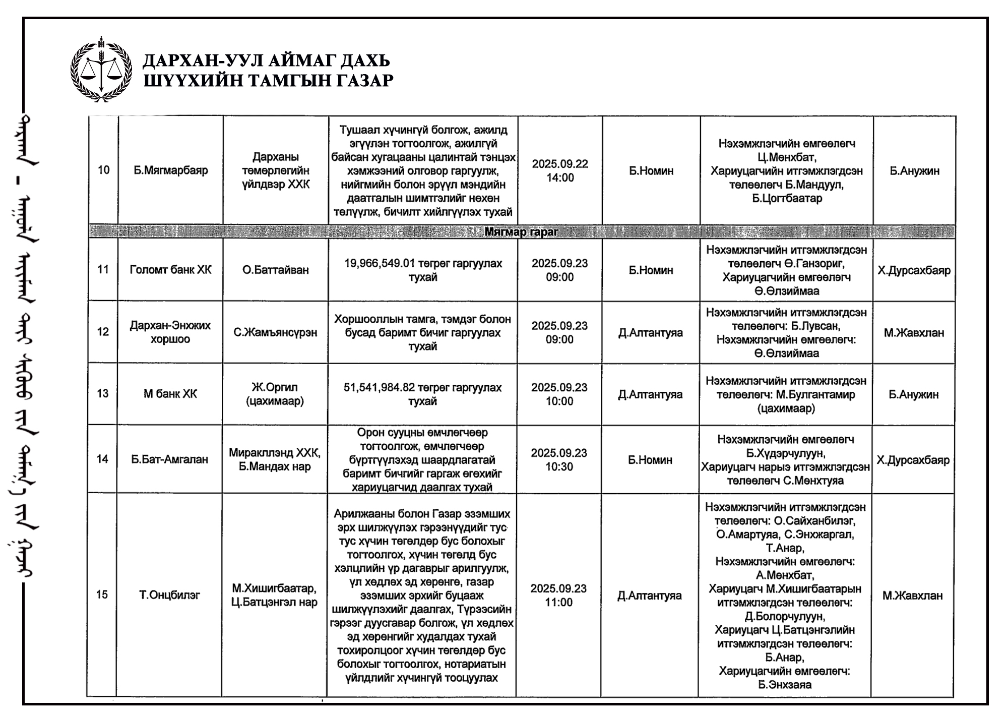 ШҮҮХ ХУРАЛДААНЫ ТОВ /Иргэний хэргийн анхан шатны шүүх 2025.09.22-26/