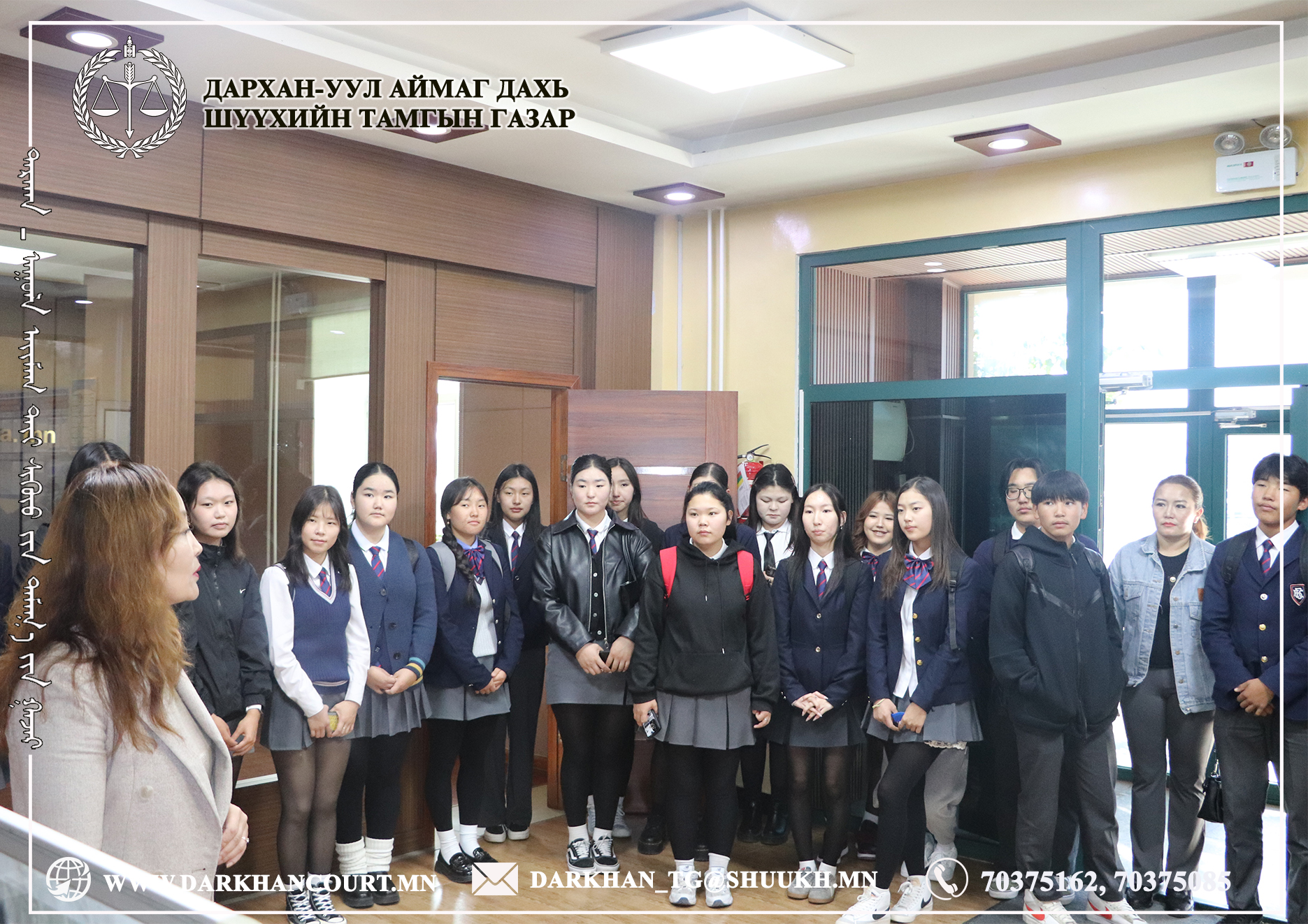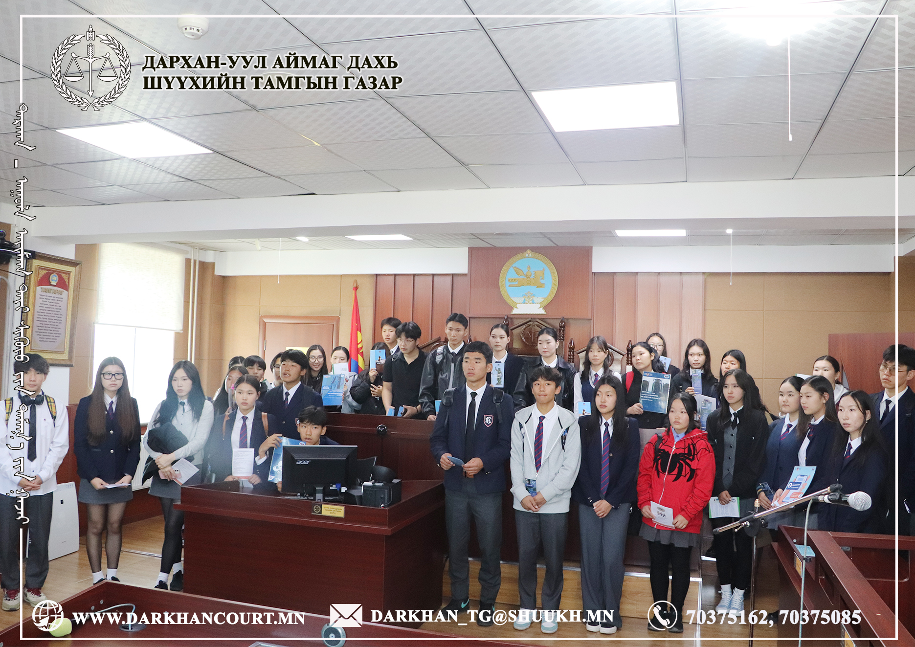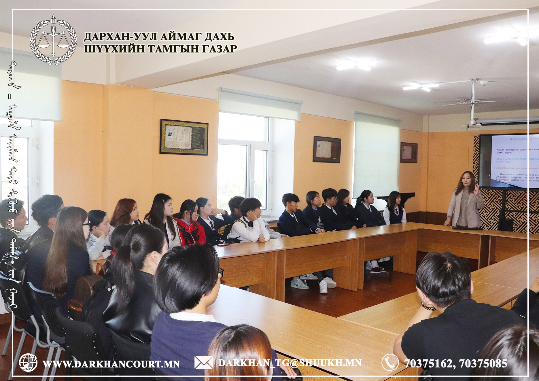 Сурагчдад “Монгол Улсын шүүхийн тогтолцоо, шүүхийн тухай болон шүүхэд итгэх иргэдийн итгэлийн тухай ойлголт”, “Дархан-Уул аймаг дахь анхан болон давж заалдах шатны шүүхийн танилцуулга, үйл ажиллагааны мэдээлэл”, “Шүүгчид нөлөөлөх нөлөөллийн тухай ойлголт”, “Хэрэг хүлээн авах, шийдвэрлэх ажиллагааны танилцуулга”, “Шүүх дэх эвлэрүүлэн зуучлах ажиллагаа”, “Шүүхийн иргэдийн төлөөлөгчийн тухай ойлголт”, “Мэргэжлээ хэрхэн зөв сонгох вэ”, “Эрх зүйч, хуульч мэргэжлийн онцлог”, “Гэмт хэрэг, зөрчлөөс хэрхэн урьдчилан сэргийлэх вэ”, “Электрон тамхины хор хөнөөл”, гэмт хэргээс урьдчилан сэргийлэх, цахим орчны гэмт хэрэг зэрэг сэдвүүдээр сургалт зохион байгууллаа.
