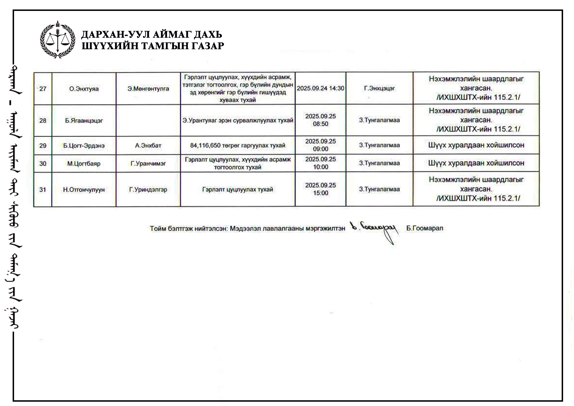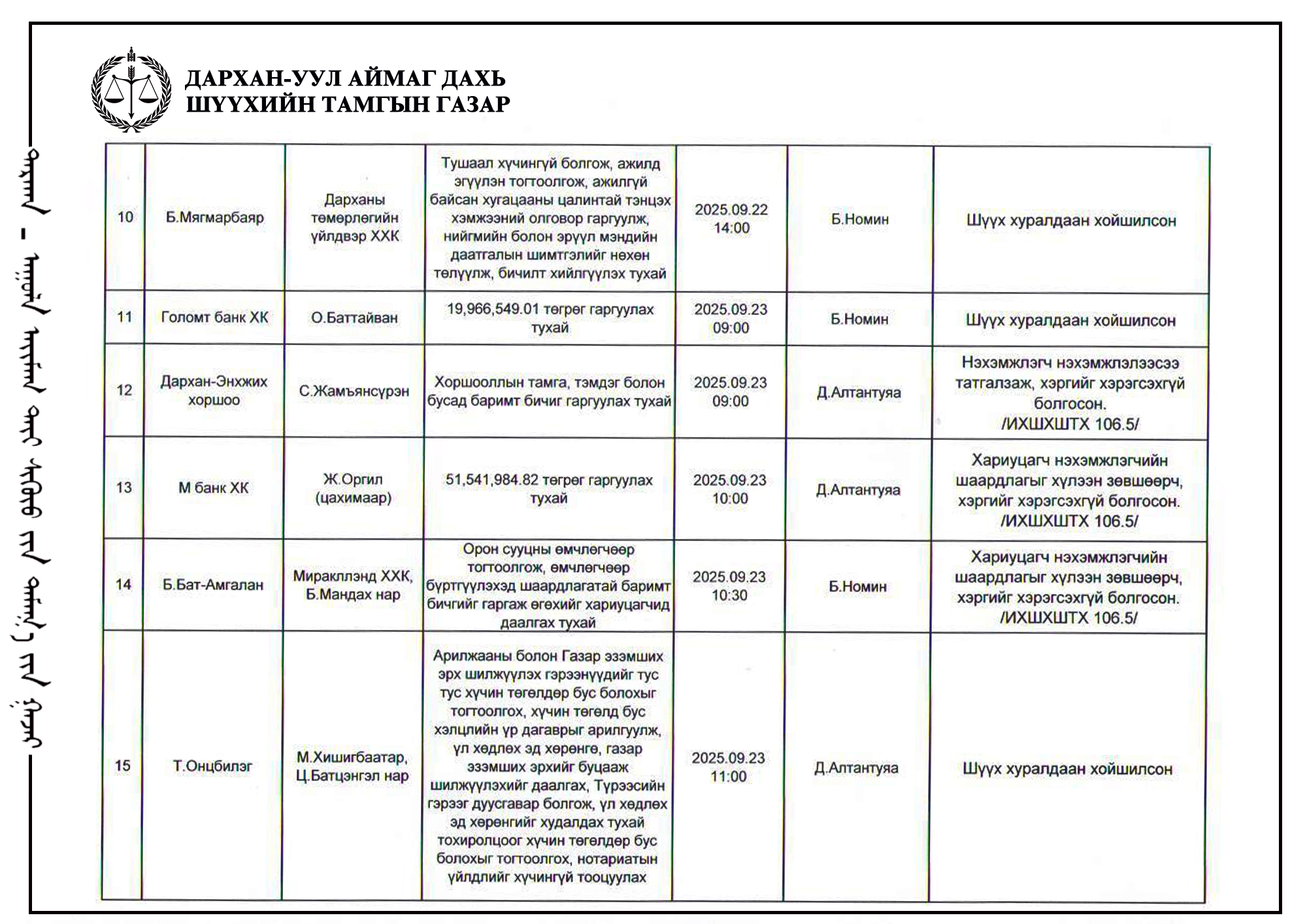 ШҮҮХ ХУРАЛДААНЫ ТОЙМ /Иргэний хэргийн анхан шатны шүүх 2025.09.22-26/