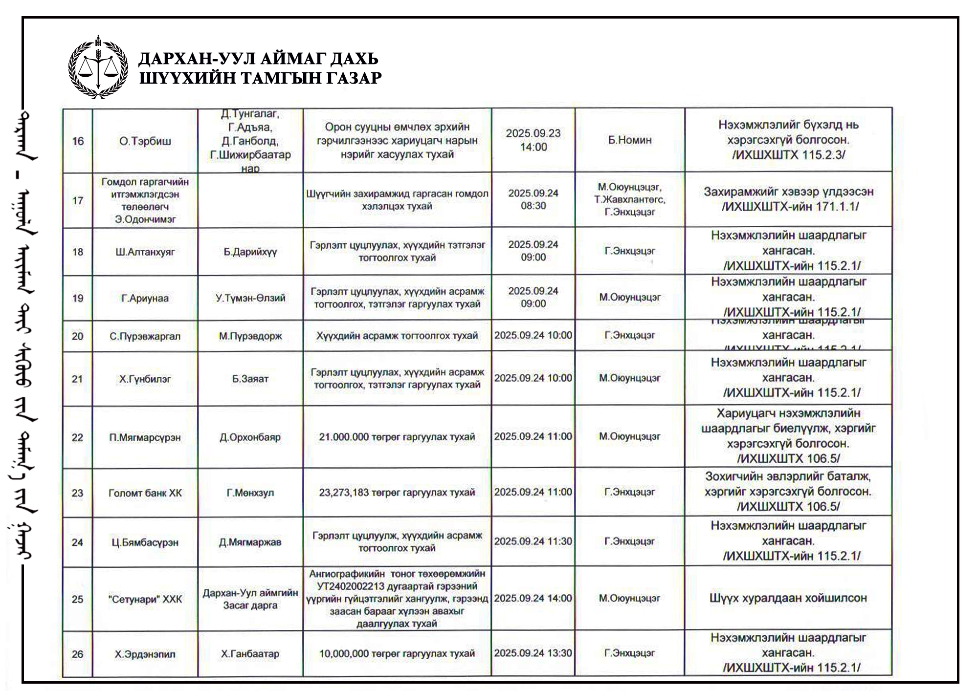 ШҮҮХ ХУРАЛДААНЫ ТОЙМ /Эрүүгийн хэргийн анхан шатны шүүх 2025.09.22-26/