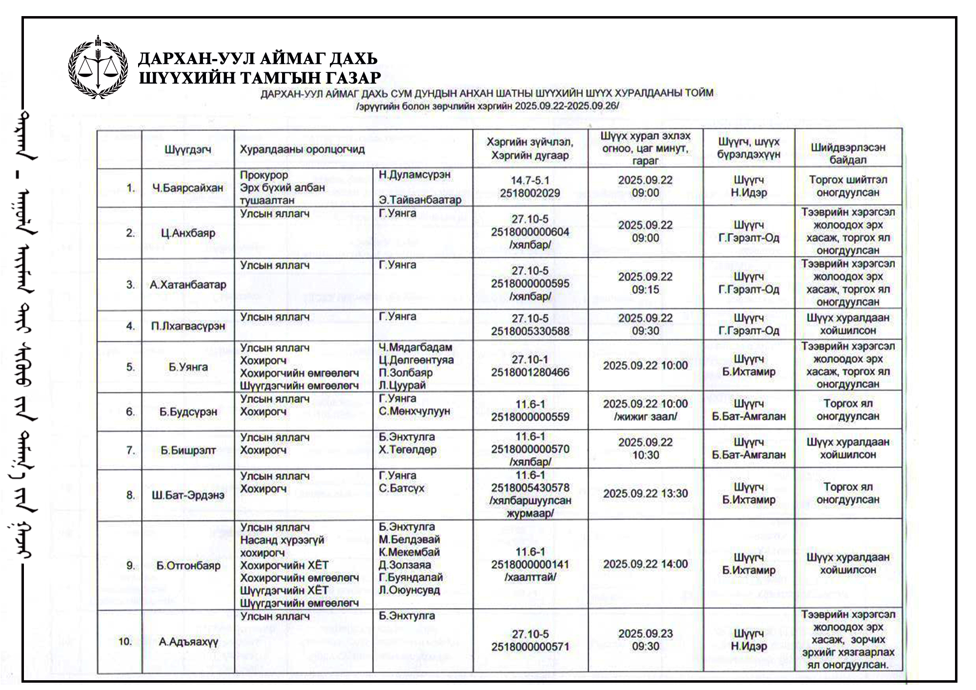 ШҮҮХ ХУРАЛДААНЫ ТОЙМ /Эрүүгийн хэргийн анхан шатны шүүх 2025.09.22-26/