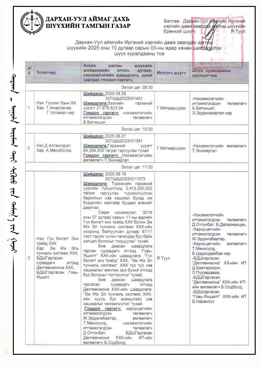 ШҮҮХ ХУРАЛДААНЫ ТОЙМ /Иргэний хэргийн анхан шатны шүүх 2025.10.06-10/