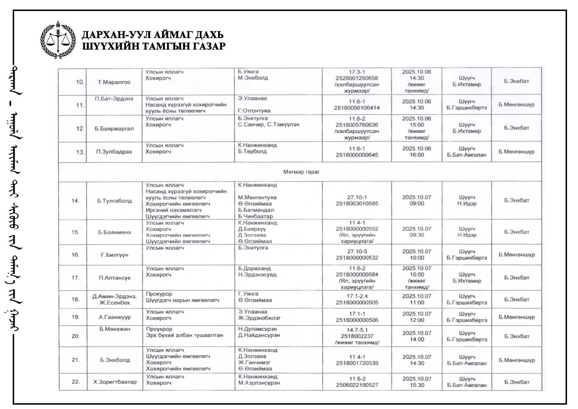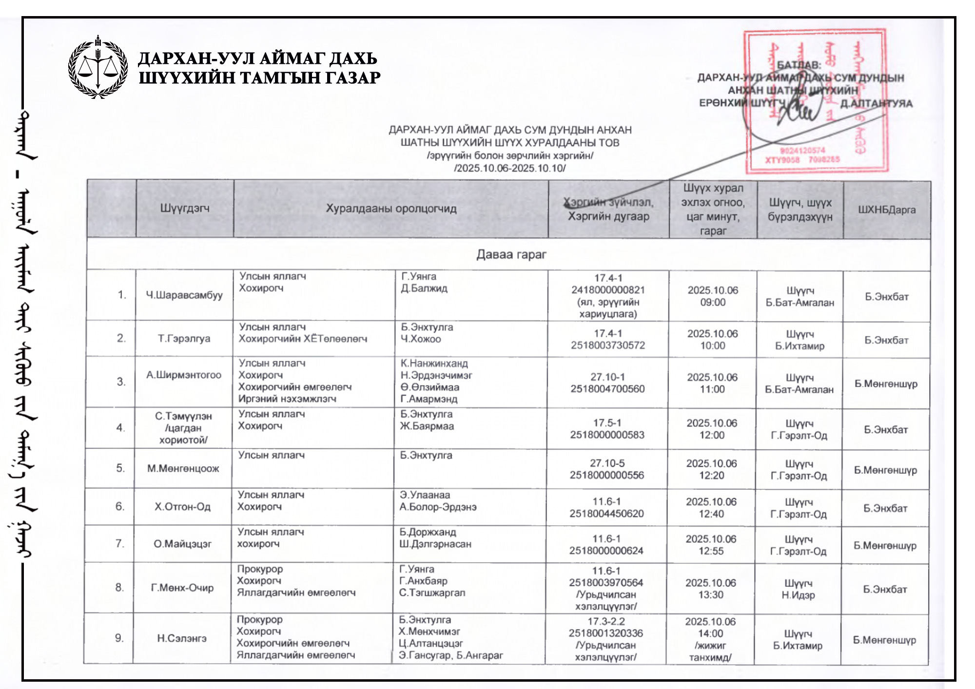 ШҮҮХ ХУРАЛДААНЫ ТОЙМ /Эрүүгийн хэргийн анхан шатны шүүх 2025.10.06-10.10/