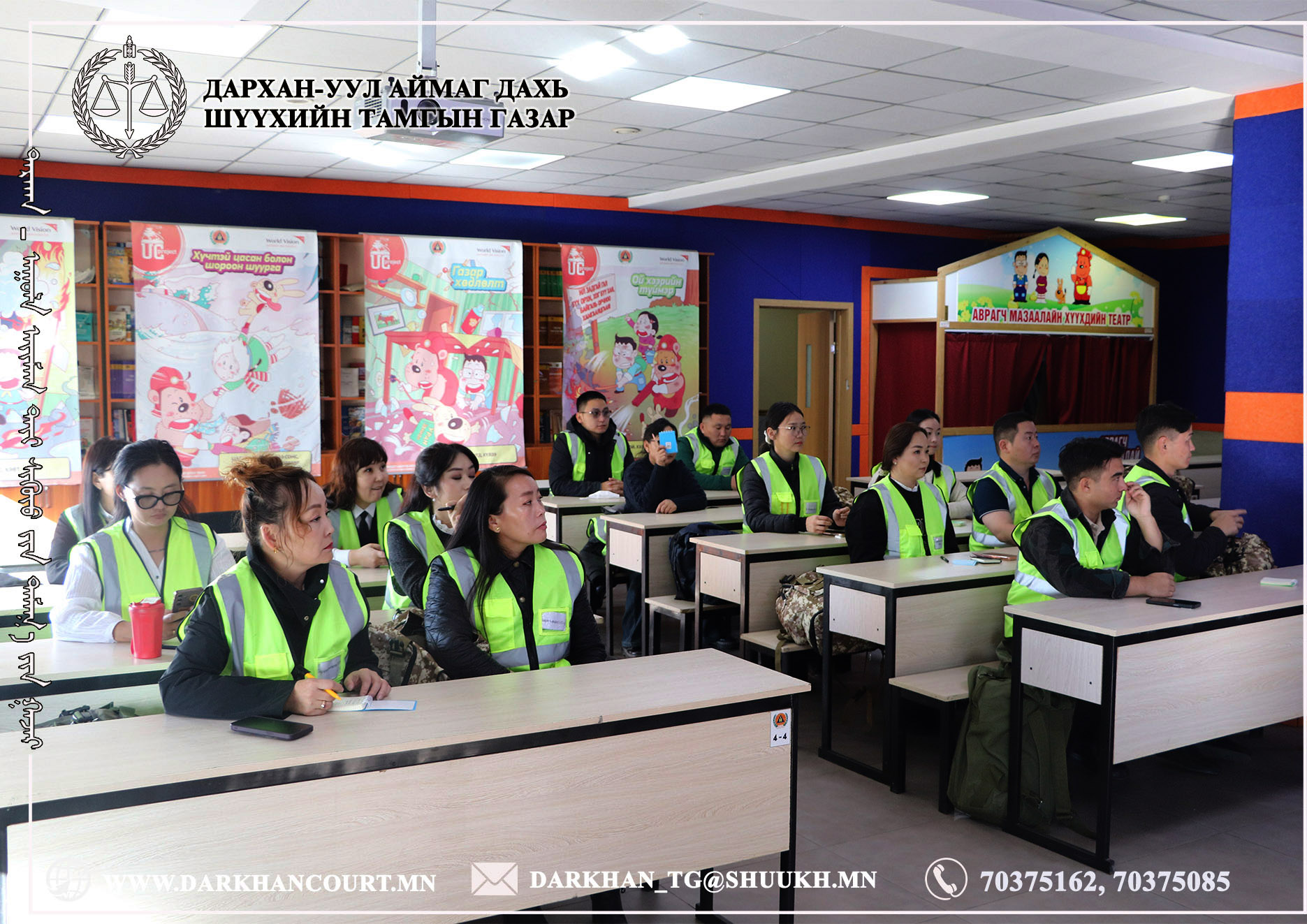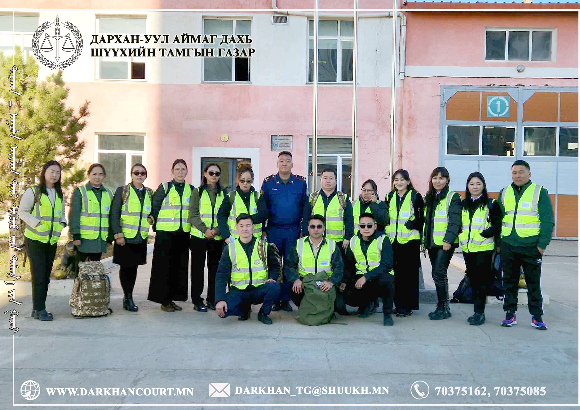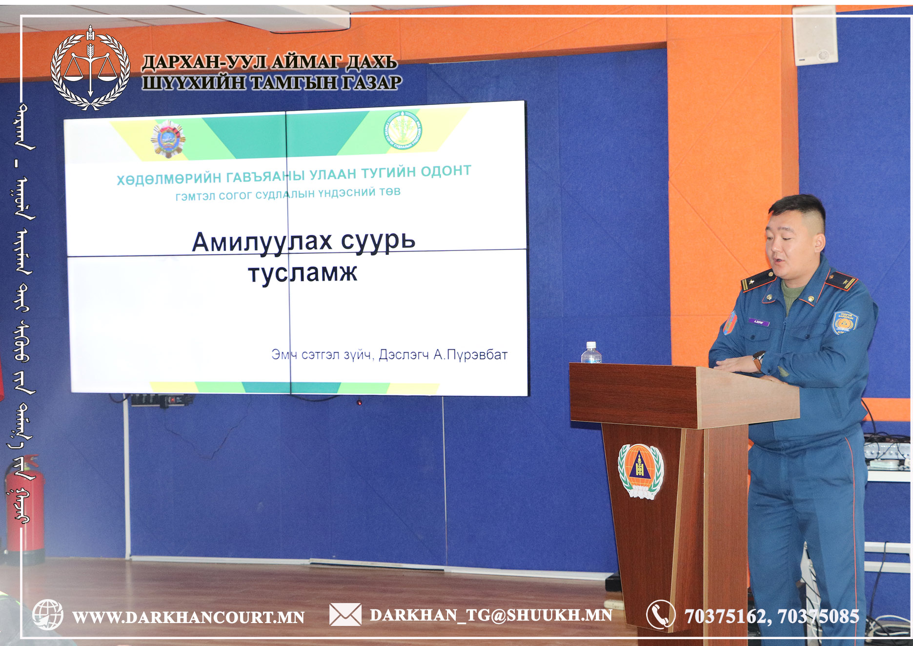 Гамшгийн үеийн дадлага, сургалтыг хамтран зохион байгуулсан Гал түймэр унтраах, аврах 22 дугаар ангийн захирагч, Хошууч А.Зориг, Эмч-Сэтгэл зүйч, Дэслэгч А.Пүрэвбат, Ангиллын сургалт, сурталчилгаа, урьдчилан сэргийлэх асуудал хариуцсан мэргэжилтэн, Ахлах дэслэгч Г.Нандин-Эрдэнэ нартаа шүүхийн хамт олноос талархал илэрхийлж, эрдэнэт хүний амь нас, эх орныхоо үнэт зүйлийг хамгаалах эх үйлсэд нь амжилт хүсэн ерөөе.