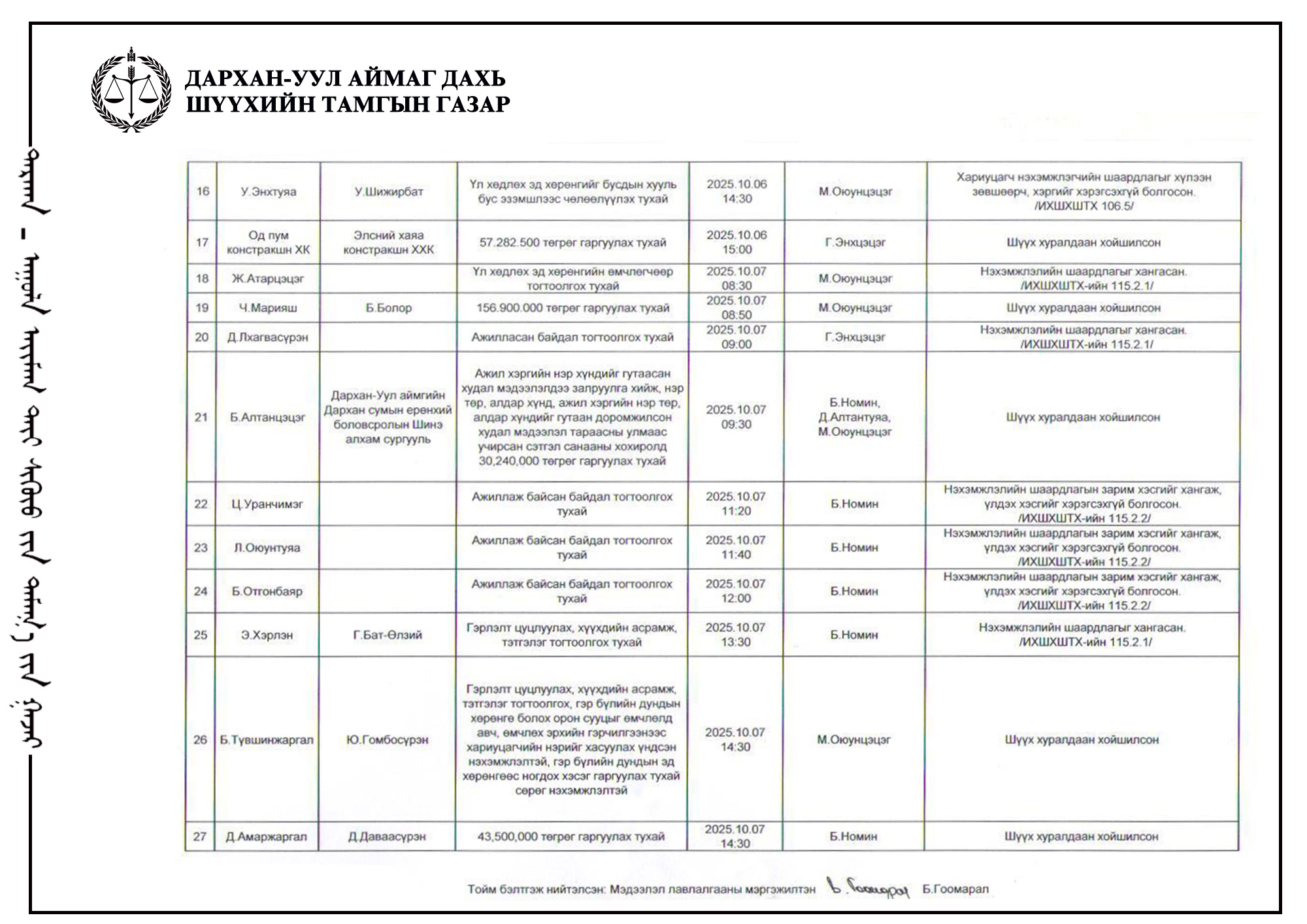 ШҮҮХ ХУРАЛДААНЫ ТОВ /Захиргааны хэргийн анхан шатны шүүх 2025.10.13-10.17/