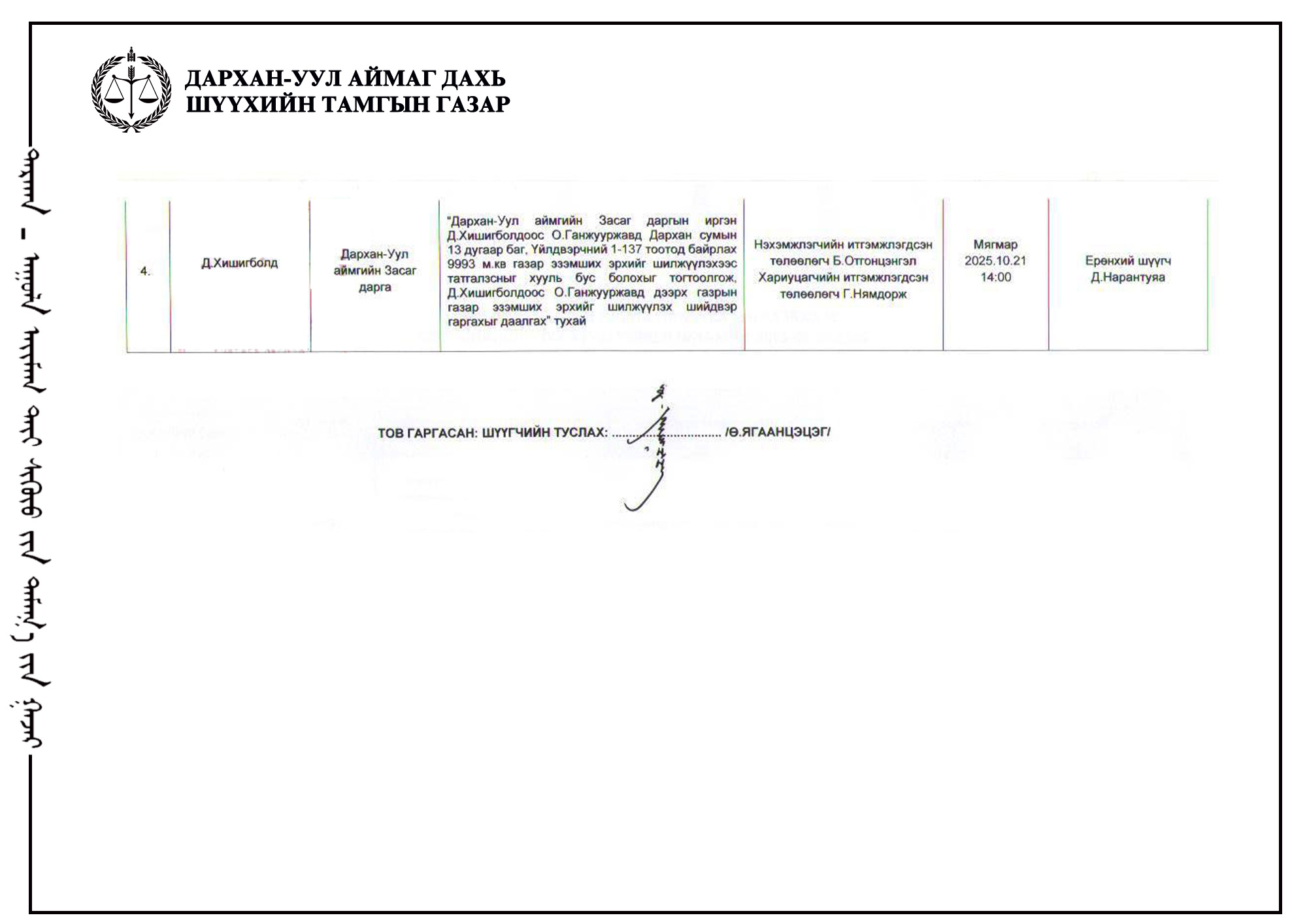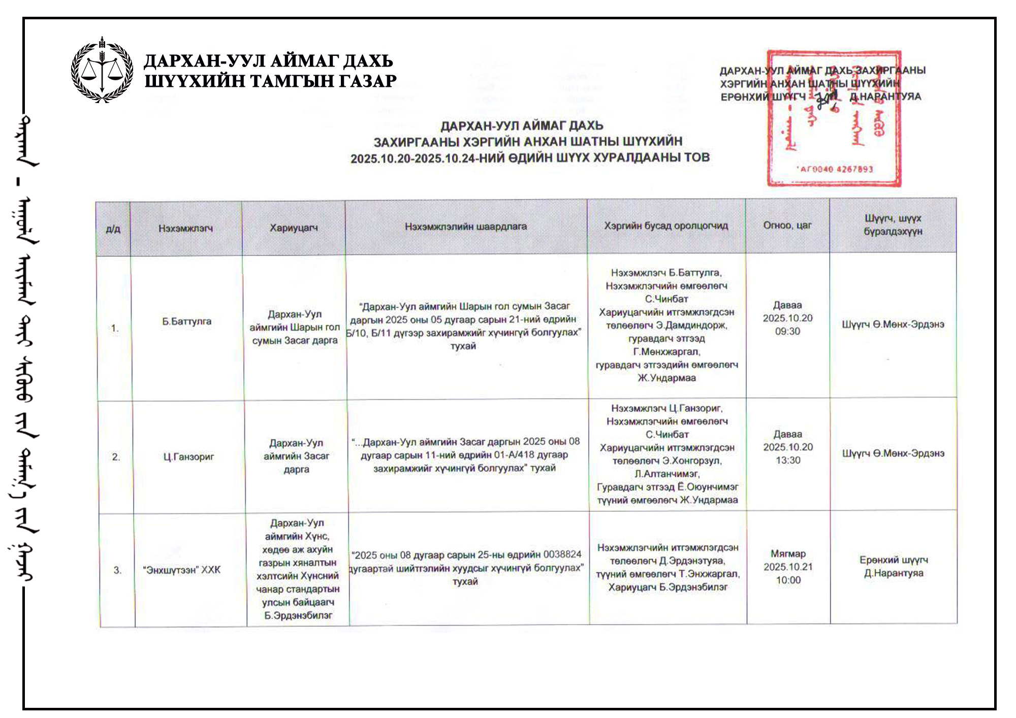 ШҮҮХ ХУРАЛДААНЫ ТОВ /Захиргааны хэргийн анхан шатны шүүх 2025.10.20-10.24/