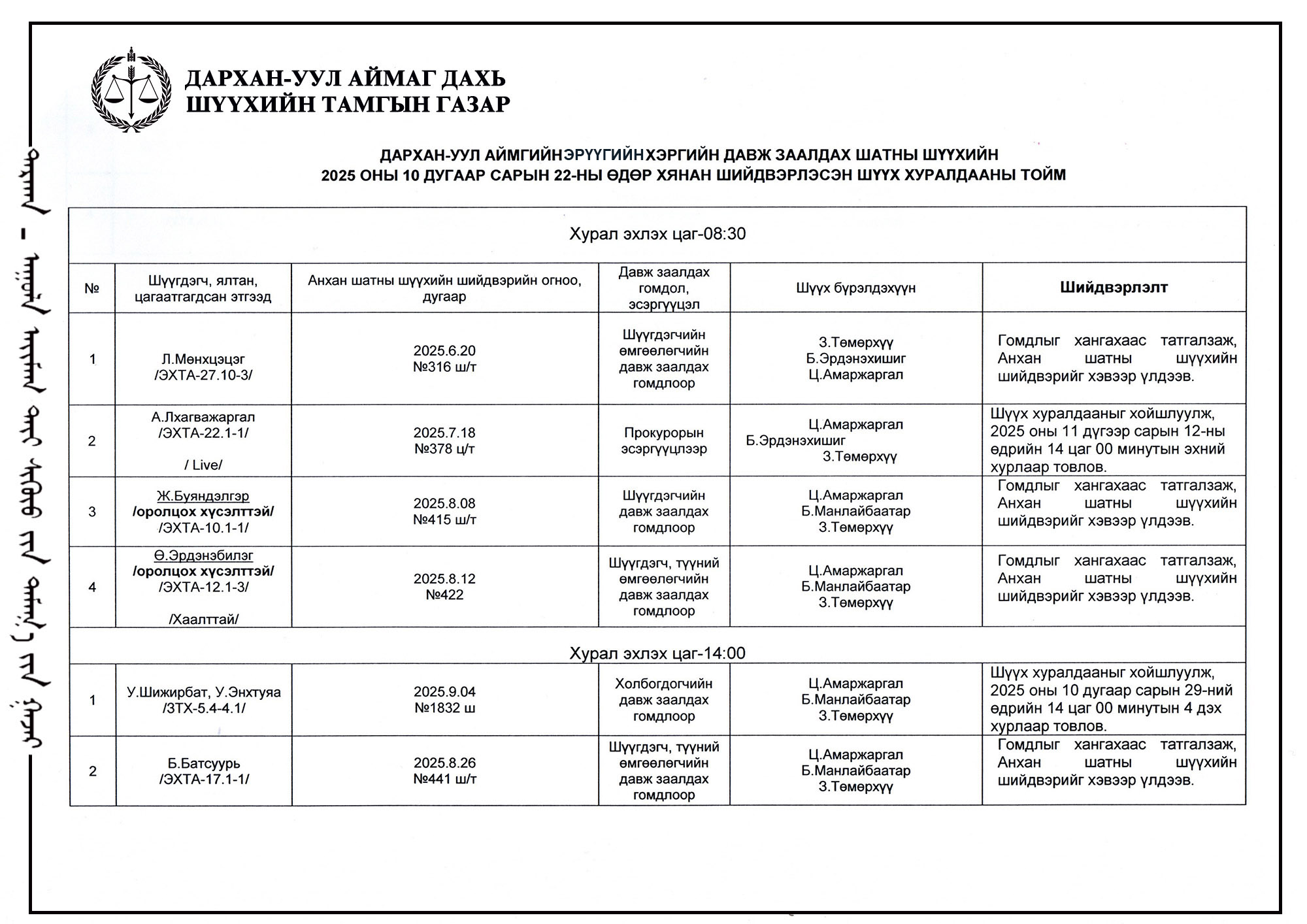 ШҮҮХ ХУРАЛДААНЫ ТОЙМ /Эрүүгийн хэргийн давж заалдах шатны шүүх 2025.10.22/